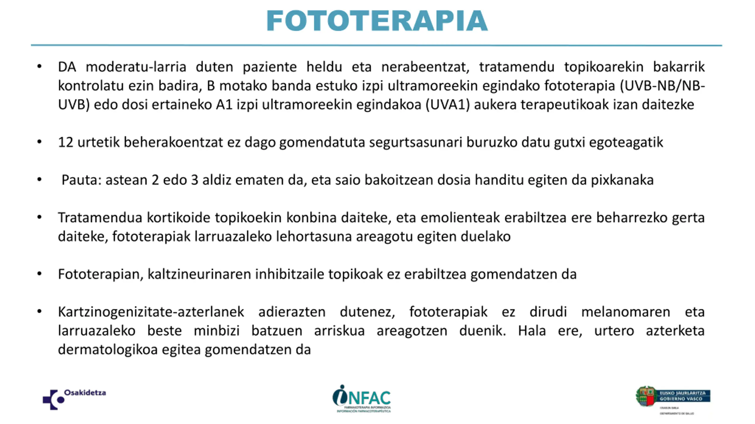 FOTOTERAPIA DA moderatu-larria duten paziente heldu eta nerabeentzat, tratamendu topikoarekin bakarrik kontrolatu ezin badira, B motako banda estuko izpi ultramoreekin egindako fototerapia (UVB-NB/NB- UVB) edo dosi ertaineko A1 izpi ultramoreekin egindakoa (UVA1) aukera terapeutikoak izan daitezke 12 urtetik beherakoentzat ez dago gomendatuta segurtsasunari buruzko datu gutxi egoteagatik Pauta: astean 2 edo 3 aldiz ematen da, eta saio bakoitzean dosia handitu egiten da pixkanaka Tratamendua kortikoide topikoekin konbina daiteke, eta emolienteak erabiltzea ere beharrezko gerta daiteke, fototerapiak larruazaleko lehortasuna areagotu egiten duelako Fototerapian, kaltzineurinaren inhibitzaile topikoak ez erabiltzea gomendatzen da Kartzinogenizitate-azterlanek adierazten dutenez, fototerapiak ez dirudi melanomaren eta larruazaleko beste minbizi batzuen arriskua areagotzen duenik. Hala ere, urtero azterketa dermatologikoa egitea gomendatzen da