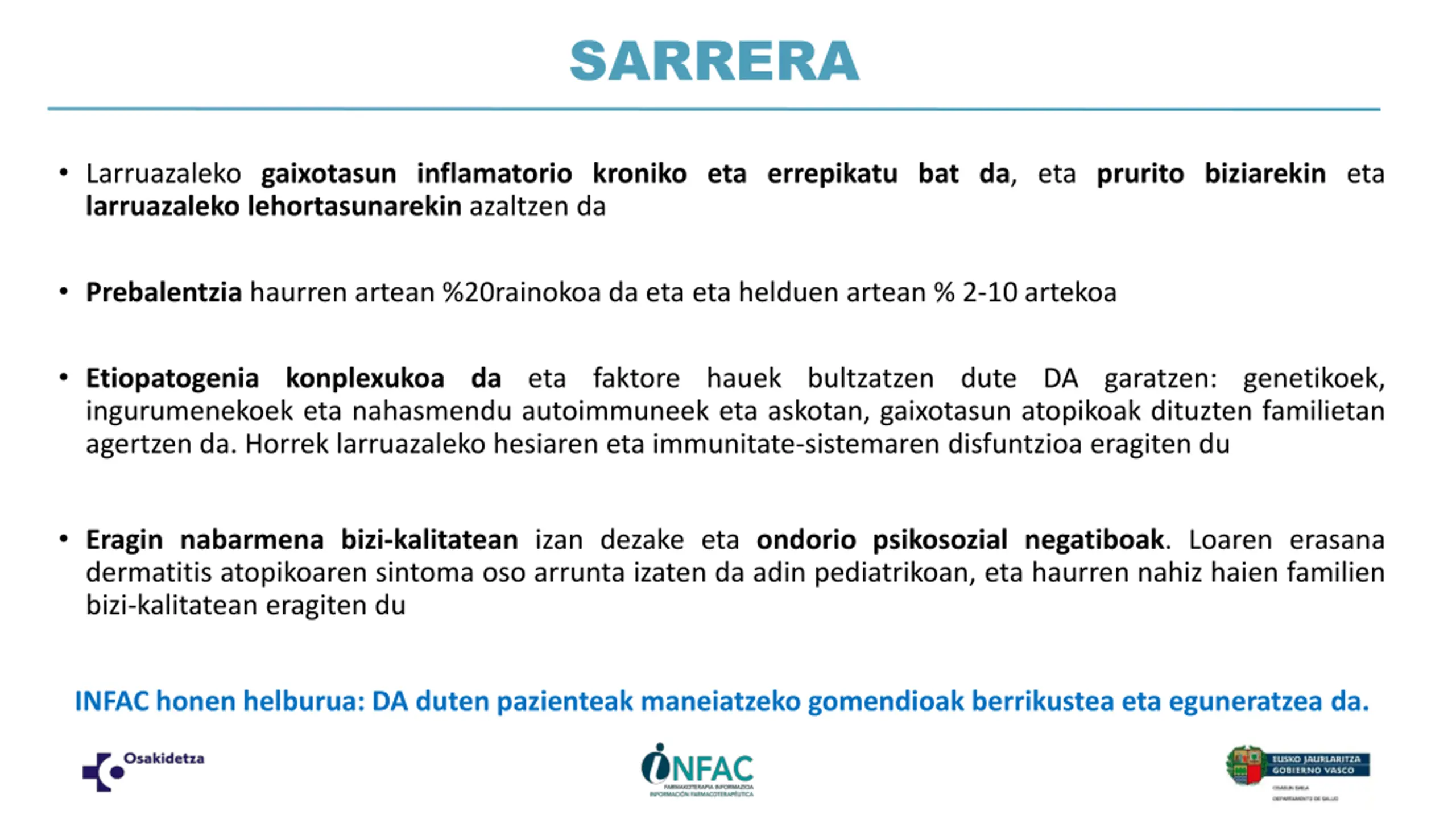 SARRERA Larruazaleko gaixotasun inflamatorio kroniko eta errepikatu bat da, eta prurito biziarekin eta larruazaleko lehortasunarekin azaltzen da Prebalentzia haurren artean %20rainokoa da eta eta helduen artean % 2-10 artekoa Etiopatogenia konplexukoa da eta faktore hauek bultzatzen dute DA garatzen: genetikoek, ingurumenekoek eta nahasmendu autoimmuneek eta askotan, gaixotasun atopikoak dituzten familietan agertzen da. Horrek larruazaleko hesiaren eta immunitate-sistemaren disfuntzioa eragiten du Eragin nabarmena bizi-kalitatean izan dezake eta ondorio psikosozial negatiboak. Loaren erasana dermatitis atopikoaren sintoma oso arrunta izaten da adin pediatrikoan, eta haurren nahiz haien familien bizi-kalitatean eragiten du INFAC honen helburua: DA duten pazienteak maneiatzeko gomendioak berrikustea eta eguneratzea da.