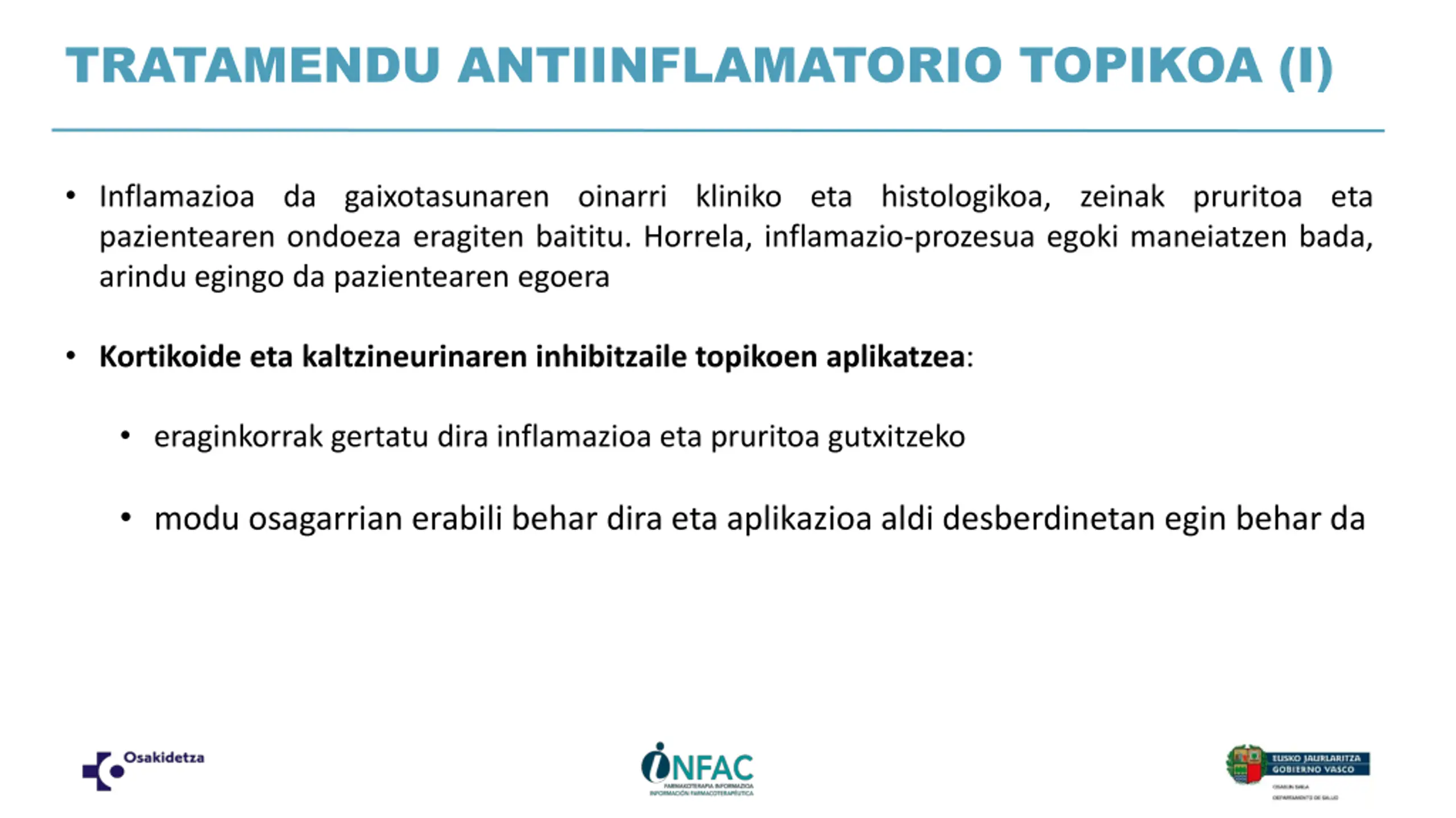 TRATAMENDU ANTIINFLAMATORIO TOPIKOA (I) Inflamazioa da gaixotasunaren oinarri kliniko eta histologikoa, zeinak pruritoa eta pazientearen ondoeza eragiten baititu. Horrela, inflamazio-prozesua egoki maneiatzen bada, arindu egingo da pazientearen egoera Kortikoide eta kaltzineurinaren inhibitzaile topikoen aplikatzea: eraginkorrak gertatu dira inflamazioa eta pruritoa gutxitzeko modu osagarrian erabili behar dira eta aplikazioa aldi desberdinetan egin behar da