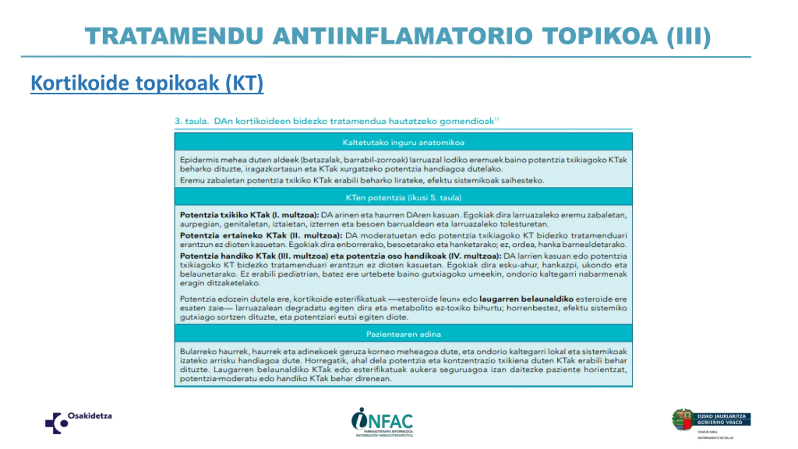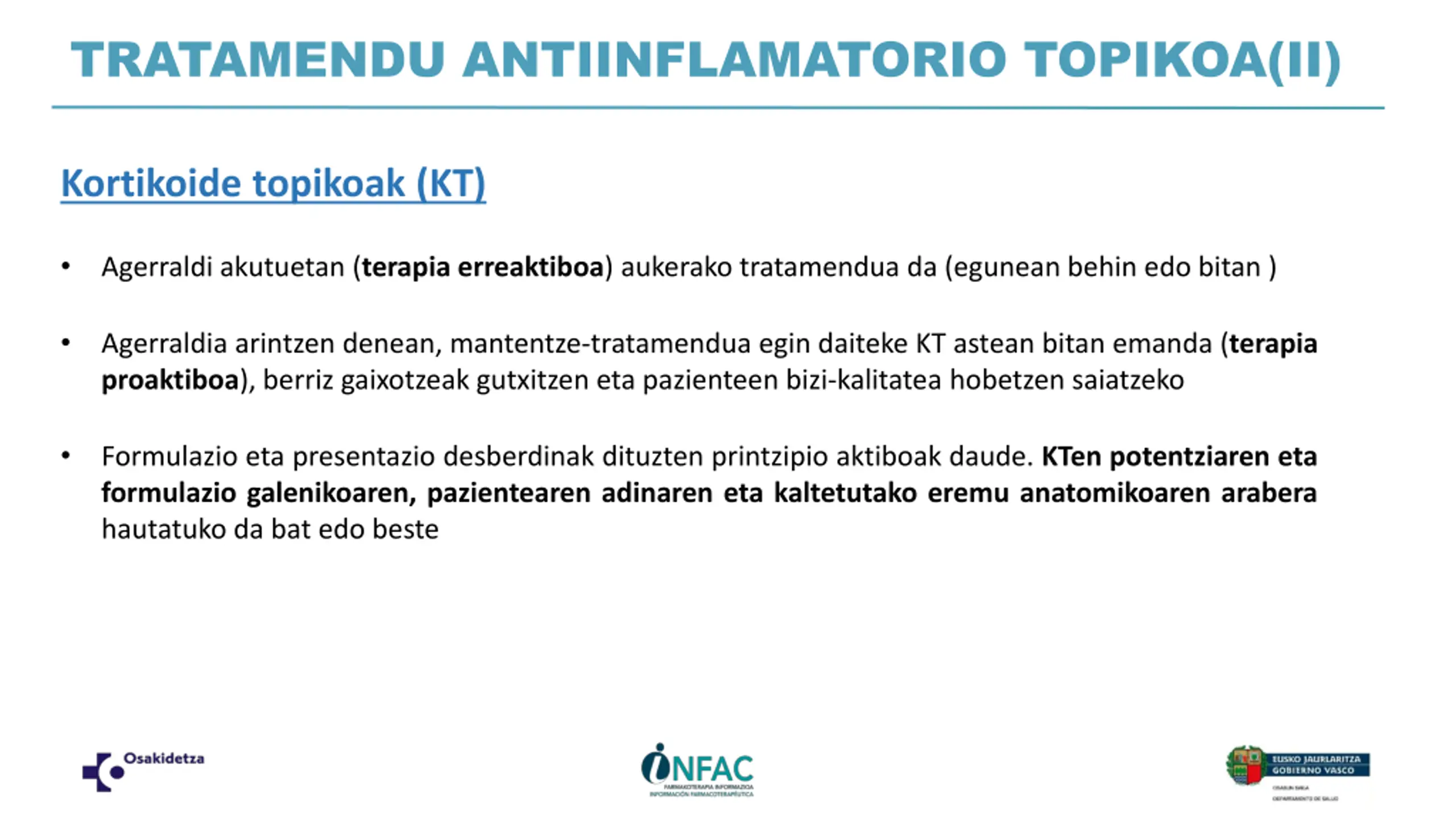 TRATAMENDU ANTIINFLAMATORIO TOPIKOA(II) Kortikoide topikoak (KT) Agerraldi akutuetan (terapia erreaktiboa) aukerako tratamendua da (egunean behin edo bitan ) Agerraldia arintzen denean, mantentze-tratamendua egin daiteke KT astean bitan emanda (terapia proaktiboa), berriz gaixotzeak gutxitzen eta pazienteen bizi-kalitatea hobetzen saiatzeko Formulazio eta presentazio desberdinak dituzten printzipio aktiboak daude. KTen potentziaren eta formulazio galenikoaren, pazientearen adinaren eta kaltetutako eremu anatomikoaren arabera hautatuko da bat edo beste