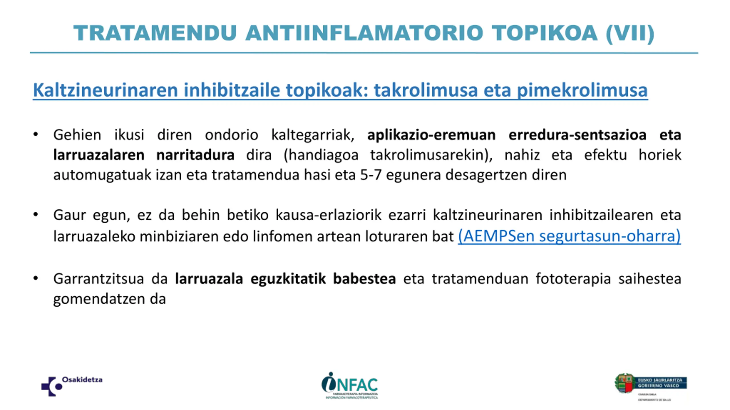 TRATAMENDU ANTIINFLAMATORIO TOPIKOA (VII) Kaltzineurinaren inhibitzaile topikoak: takrolimusa eta pimekrolimusa Gehien ikusi diren ondorio kaltegarriak, aplikazio-eremuan erredura-sentsazioa eta larruazalaren narritadura dira (handiagoa takrolimusarekin), nahiz eta efektu horiek automugatuak izan eta tratamendua hasi eta 5-7 egunera desagertzen diren Gaur egun, ez da behin betiko kausa-erlaziorik ezarri kaltzineurinaren inhibitzailearen eta larruazaleko minbiziaren edo linfomen artean loturaren bat (AEMPSen segurtasun-oharra) Garrantzitsua da larruazala eguzkitatik babestea eta tratamenduan fototerapia saihestea gomendatzen da