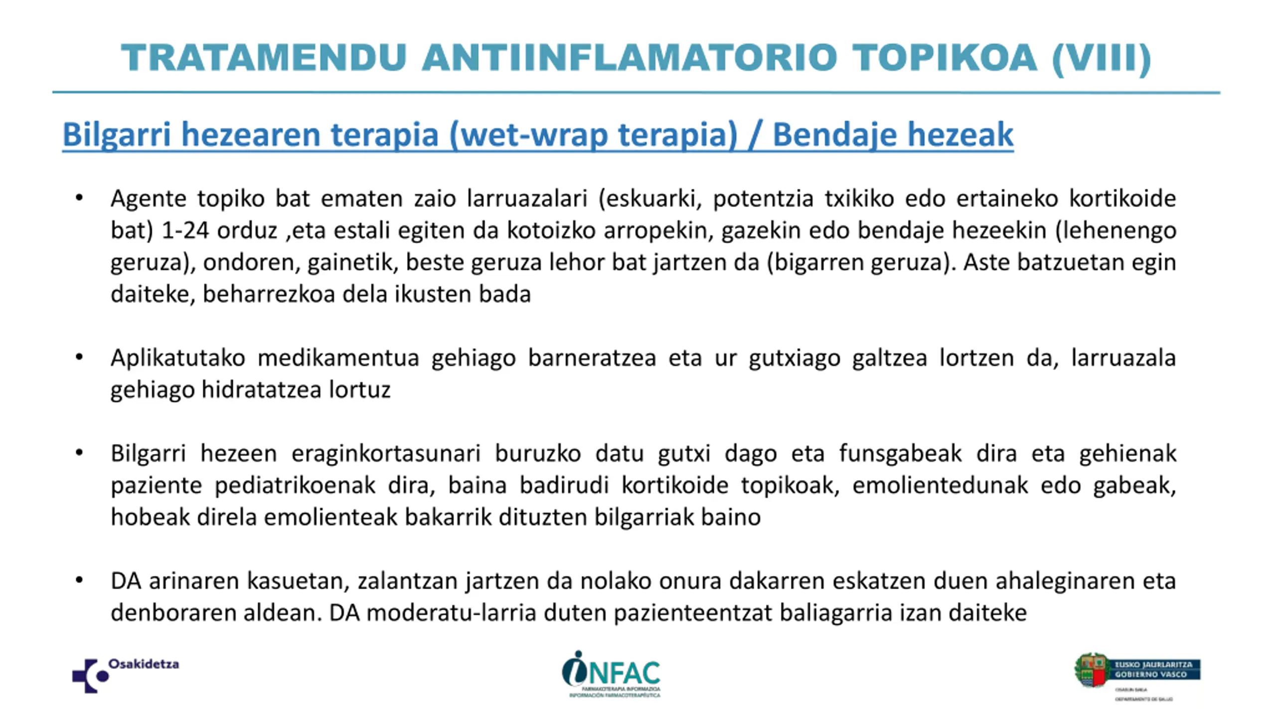 TRATAMENDU ANTIINFLAMATORIO TOPIKOA (VIII) Bilgarri hezearen terapia (wet-wrap terapia) / Bendaje hezeak Agente topiko bat ematen zaio larruazalari (eskuarki, potentzia txikiko edo ertaineko kortikoide bat) 1-24 orduz ,eta estali egiten da kotoizko arropekin, gazekin edo bendaje hezeekin (lehenengo geruza), ondoren, gainetik, beste geruza lehor bat jartzen da (bigarren geruza). Aste batzuetan egin daiteke, beharrezkoa dela ikusten bada Aplikatutako medikamentua gehiago barneratzea eta ur gutxiago galtzea lortzen da, larruazala gehiago hidratatzea lortuz Bilgarri hezeen eraginkortasunari buruzko datu gutxi dago eta funsgabeak dira eta gehienak paziente pediatrikoenak dira, baina badirudi kortikoide topikoak, emolientedunak edo gabeak, hobeak direla emolienteak bakarrik dituzten bilgarriak baino DA arinaren kasuetan, zalantzan jartzen da nolako onura dakarren eskatzen duen ahaleginaren eta denboraren aldean. DA moderatu-larria duten pazienteentzat baliagarria izan daiteke