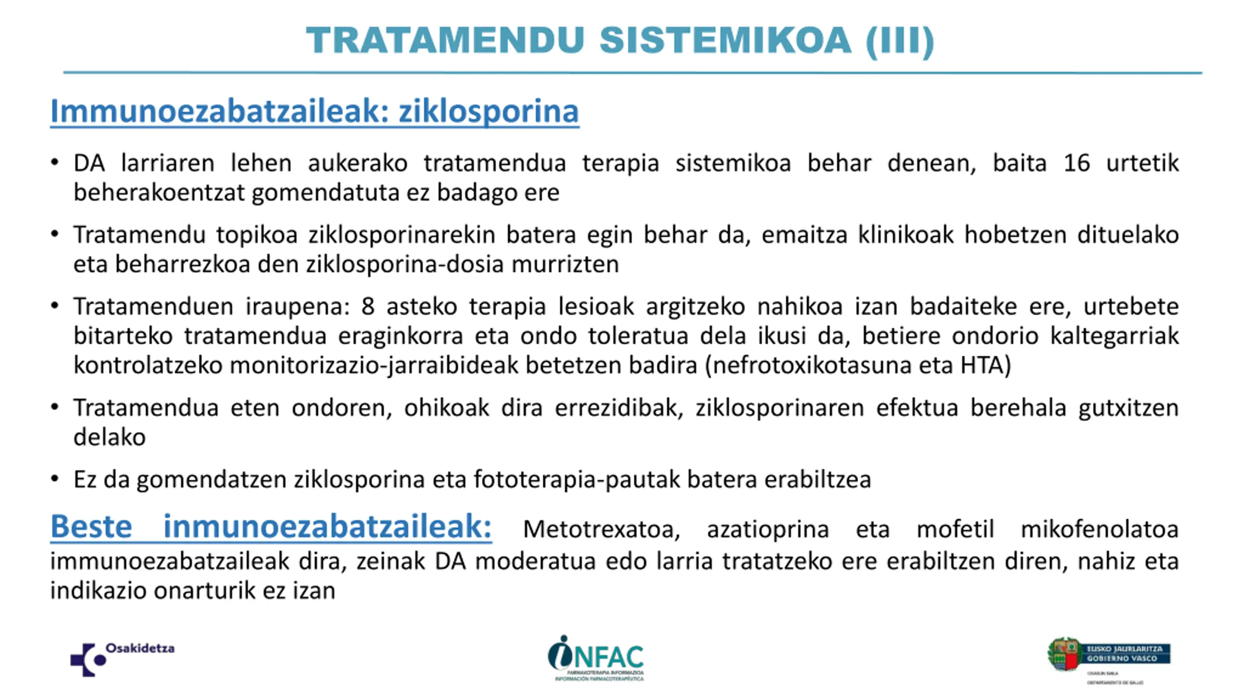 TRATAMENDU SISTEMIKOA (III) Immunoezabatzaileak: ziklosporina DA larriaren lehen aukerako tratamendua terapia sistemikoa behar denean, baita 16 urtetik beherakoentzat gomendatuta ez badago ere Tratamendu topikoa ziklosporinarekin batera egin behar da, emaitza klinikoak hobetzen dituelako eta beharrezkoa den ziklosporina-dosia murrizten Tratamenduen iraupena: 8 asteko terapia lesioak argitzeko nahikoa izan badaiteke ere, urtebete bitarteko tratamendua eraginkorra eta ondo toleratua dela ikusi da, betiere ondorio kaltegarriak kontrolatzeko monitorizazio-jarraibideak betetzen badira (nefrotoxikotasuna eta HTA) Tratamendua eten ondoren, ohikoak dira errezidibak, ziklosporinaren efektua berehala gutxitzen delako Ez da gomendatzen ziklosporina eta fototerapia-pautak batera erabiltzea Beste inmunoezabatzaileak: Metotrexatoa, azatioprina eta mofetil mikofenolatoa immunoezabatzaileak dira, zeinak DA moderatua edo larria tratatzeko ere erabiltzen diren, nahiz eta indikazio onarturik ez izan
