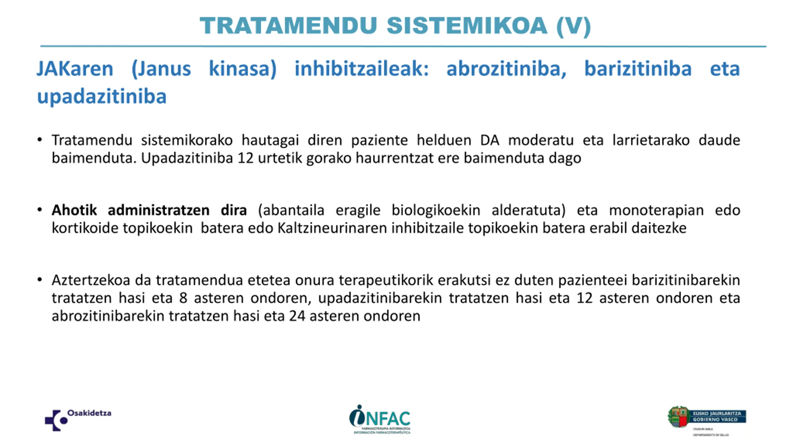 TRATAMENDU SISTEMIKOA (V) JAKaren (Janus kinasa) inhibitzaileak: abrozitiniba, barizitiniba eta upadazitiniba Tratamendu sistemikorako hautagai diren paziente helduen DA moderatu eta larrietarako daude baimenduta. Upadazitiniba 12 urtetik gorako haurrentzat ere baimenduta dago Ahotik administratzen dira (abantaila eragile biologikoekin alderatuta) eta monoterapian edo kortikoide topikoekin batera edo Kaltzineurinaren inhibitzaile topikoekin batera erabil daitezke Aztertzekoa da tratamendua etetea onura terapeutikorik erakutsi ez duten pazienteei barizitinibarekin tratatzen hasi eta 8 asteren ondoren, upadazitinibarekin tratatzen hasi eta 12 asteren ondoren eta abrozitinibarekin tratatzen hasi eta 24 asteren ondoren