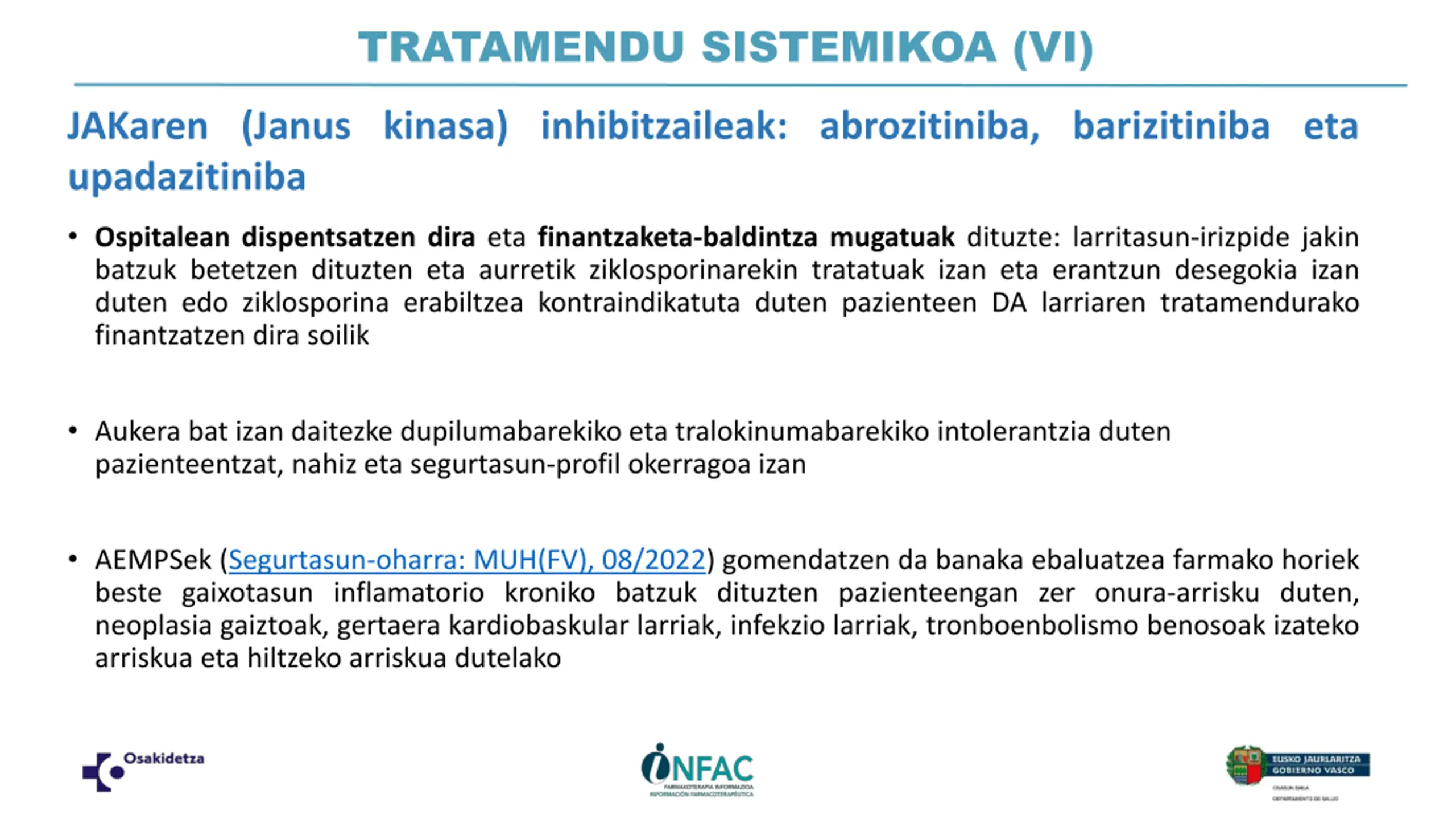 TRATAMENDU SISTEMIKOA (VI) JAKaren (Janus kinasa) inhibitzaileak: abrozitiniba, barizitiniba eta upadazitiniba Ospitalean dispentsatzen dira eta finantzaketa-baldintza mugatuak dituzte: larritasun-irizpide jakin batzuk betetzen dituzten eta aurretik ziklosporinarekin tratatuak izan eta erantzun desegokia izan duten edo ziklosporina erabiltzea kontraindikatuta duten pazienteen DA larriaren tratamendurako finantzatzen dira soilik Aukera bat izan daitezke dupilumabarekiko eta tralokinumabarekiko intolerantzia duten pazienteentzat, nahiz eta segurtasun-profil okerragoa izan AEMPSek (Segurtasun-oharra: MUH(FV), 08/2022) gomendatzen da banaka ebaluatzea farmako horiek beste gaixotasun inflamatorio kroniko batzuk dituzten pazienteengan zer onura-arrisku duten, neoplasia gaiztoak, gertaera kardiobaskular larriak, infekzio larriak, tronboenbolismo benosoak izateko arriskua eta hiltzeko arriskua dutelako