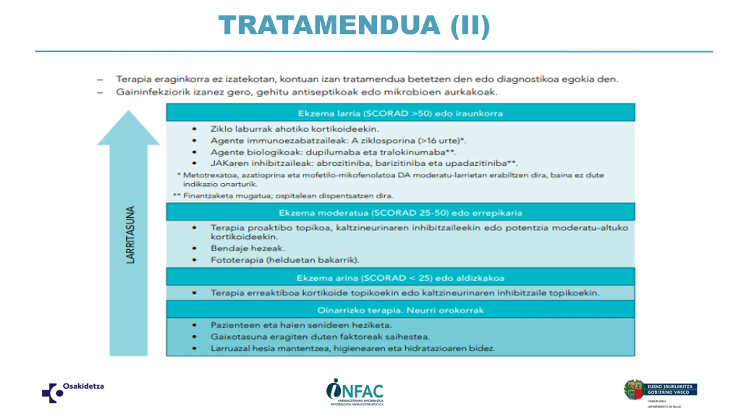 TRATAMENDU SISTEMIKOA (IV) Agente biologikoak: dupilumaba eta tralokinumaba Paziente helduetan eta 12 urtetik gorako nerabeetan DA moderatu-larria tratatzeko baimenduta daude. Dupliumaba 6-11 urteko umeen DA larria tratatzeko baimenduta ere badago Larruazalpetik administratzen dira, eta kortikoide topikoekin eta kaltzineurinaren inhibitzaile topikoekin batera erabil daitezke Tratamendua etetea gomendatzen da 16 asteko tratamenduaren ondoren erantzunik eman ez duten pazienteei Ospitalean dispentsatzen dira eta finantzaketa-baldintza mugatuak dituzte. Larritasun-irizpide jakin batzuk betetzen dituzten eta aurretik ziklosporinarekin tratatuak izan eta erantzun desegokia izan duten edo ziklosporina erabiltzea kontraindikatuta duten pazienteen DA larriaren tratamendurako finantzatzen dira soilik Ondorio kaltegarri ohikoenen artean konjuntibitisa eta, gutxiagotan, keratitisa nabarmentzen dira. Bi horien tratamendurako, aldi berean malko artifizialak erabiltzea gomendatzen da, eta tratamendu estandarrarekin konpontzen ez den konjuntibitiserako, azterketa oftalmologikoa egitea. Konjuntibitis kronikoen epe luzeko eragina ezezaguna da