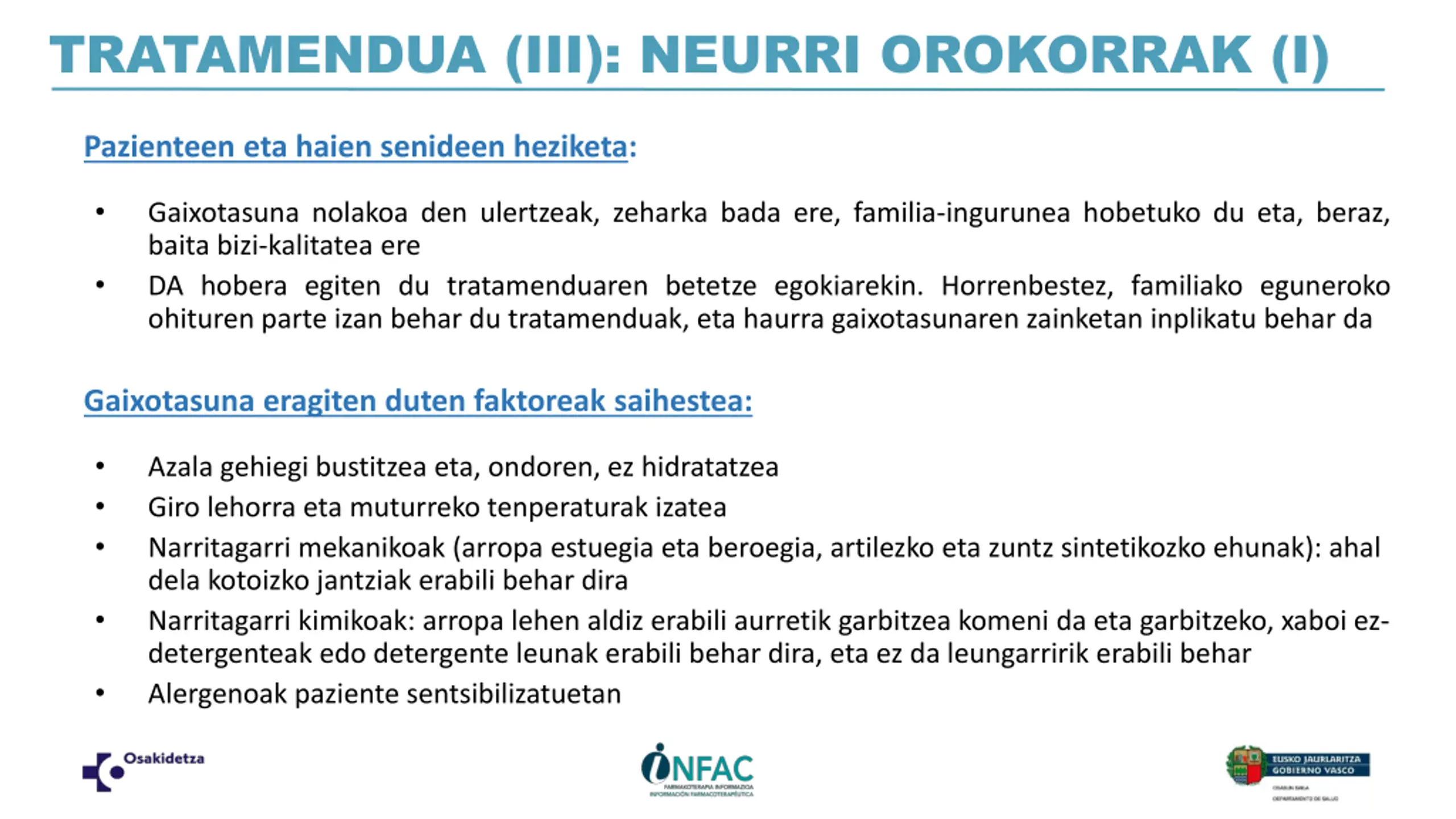 TRATAMENDUA (III): NEURRI OROKORRAK (I) Pazienteen eta haien senideen heziketa: Gaixotasuna nolakoa den ulertzeak, zeharka bada ere, familia-ingurunea hobetuko du eta, beraz, baita bizi-kalitatea ere DA hobera egiten du tratamenduaren betetze egokiarekin. Horrenbestez, familiako eguneroko ohituren parte izan behar du tratamenduak, eta haurra gaixotasunaren zainketan inplikatu behar da Gaixotasuna eragiten duten faktoreak saihestea: Azala gehiegi bustitzea eta, ondoren, ez hidratatzea Giro lehorra eta muturreko tenperaturak izatea Narritagarri mekanikoak (arropa estuegia eta beroegia, artilezko eta zuntz sintetikozko ehunak): ahal dela kotoizko jantziak erabili behar dira Narritagarri kimikoak: arropa lehen aldiz erabili aurretik garbitzea komeni da eta garbitzeko, xaboi ez- detergenteak edo detergente leunak erabili behar dira, eta ez da leungarririk erabili behar Alergenoak paziente sentsibilizatuetan