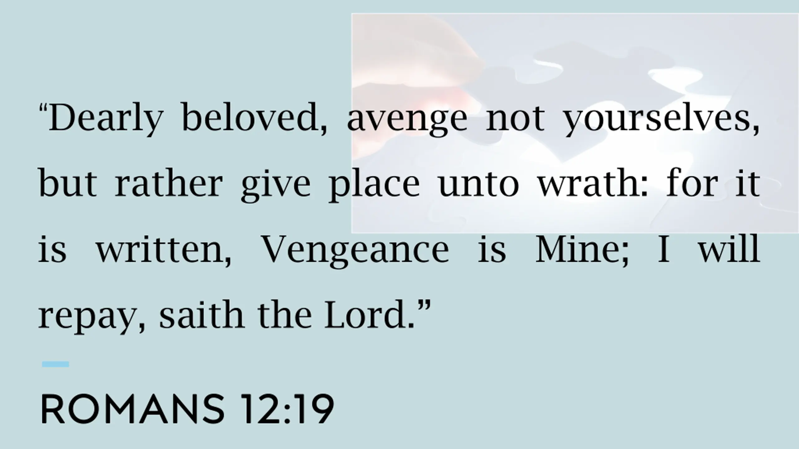 Dearly beloved, avenge not yourselves, but rather give place unto wrath: for it is written, Vengeance is Mine; I will repay, saith the Lord. ROMANS 12:19