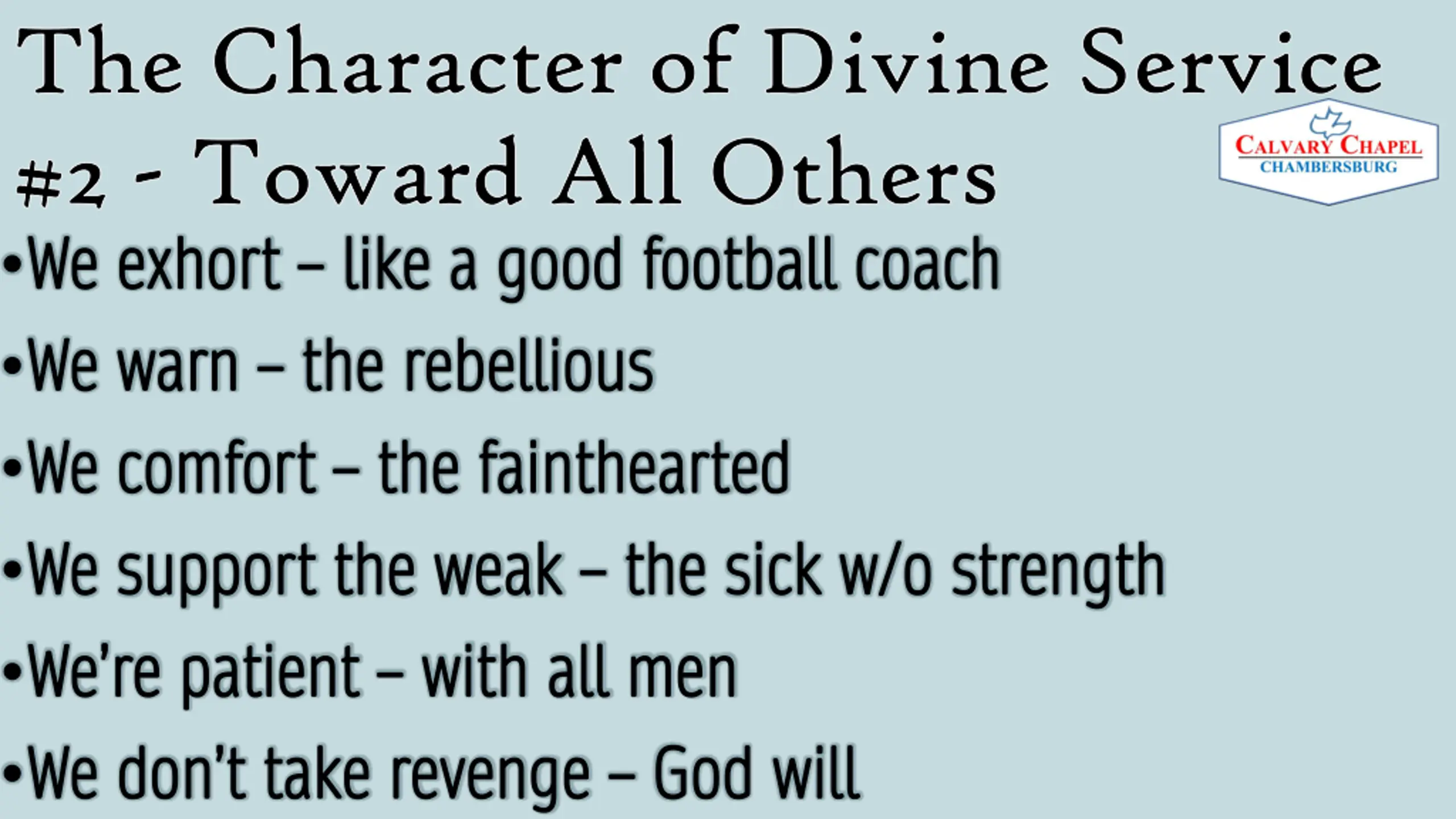 The Character of Divine Service The Character of Divine Service #2 #2 - - Toward All Others Toward All Others We exhort We exhort like a good football coach like a good football coach We warn We warn the rebellious the rebellious We comfort We comfort the fainthearted the fainthearted We support the weak We support the weak the sick w/o strength the sick w/o strength We re patient We re patient with all men with all men We don t take revenge We don t take revenge God will God will