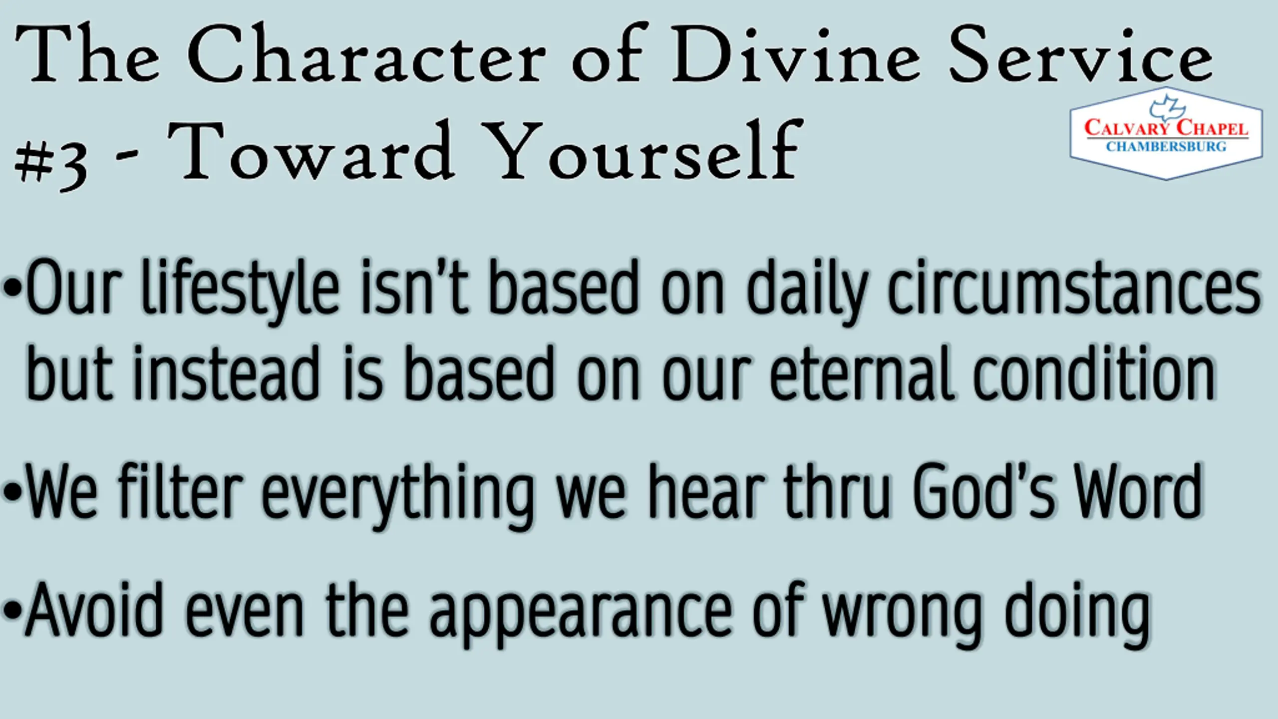 The Character of Divine Service The Character of Divine Service #3 #3 - - Toward Yourself Toward Yourself Our lifestyle isn t based on daily circumstances Our lifestyle isn t based on daily circumstances but instead is based on our eternal condition but instead is based on our eternal condition We filter everything we hear thru God s Word We filter everything we hear thru God s Word Avoid even the appearance of wrong doing Avoid even the appearance of wrong doing