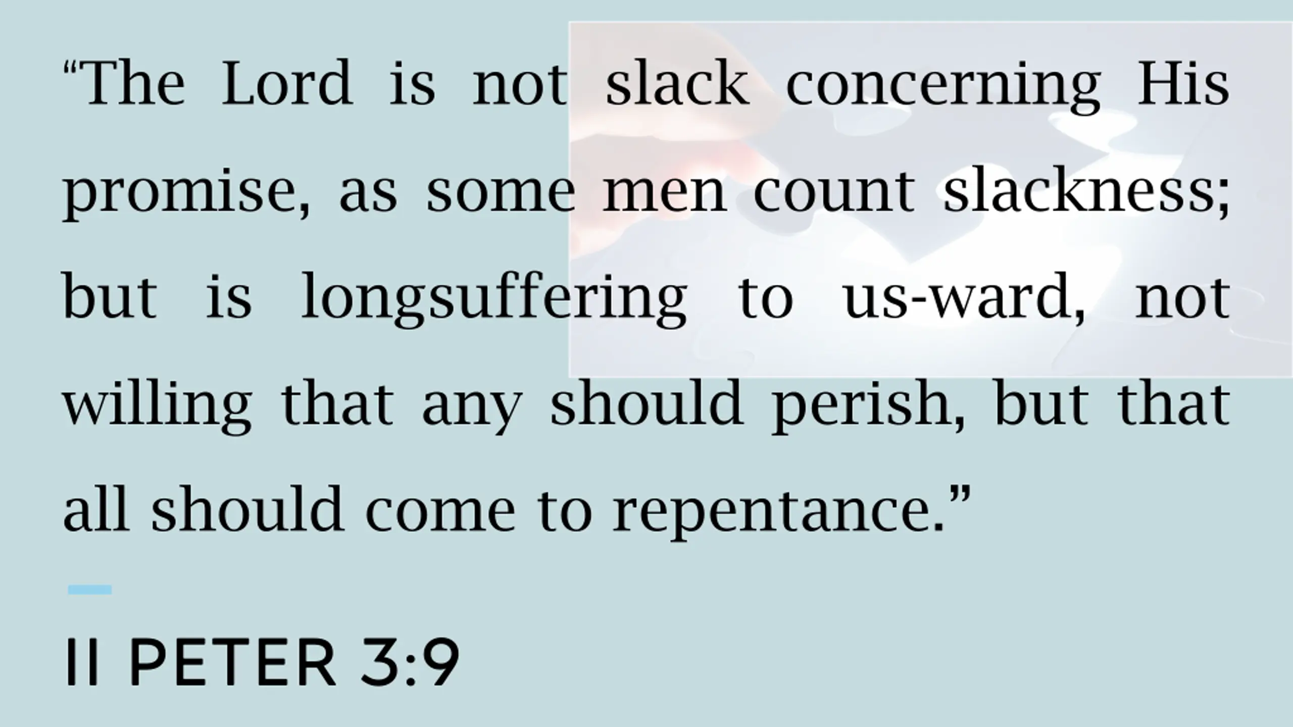 The Lord is not slack concerning His promise, as some men count slackness; but is longsuffering to us-ward, not willing that any should perish, but that all should come to repentance. II PETER 3:9