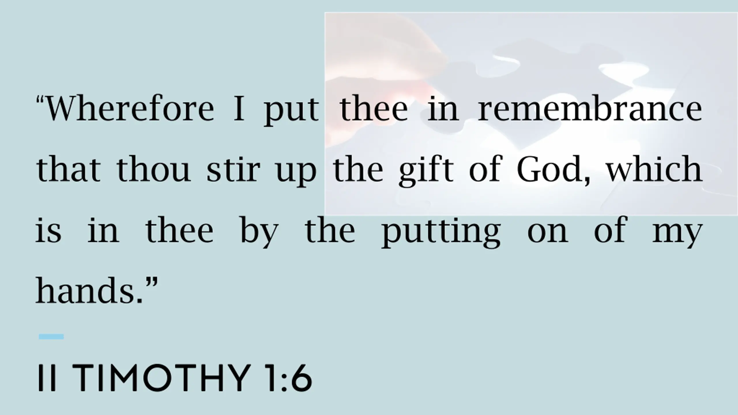 Wherefore I put thee in remembrance that thou stir up the gift of God, which is in thee by the putting on of my hands. II TIMOTHY 1:6