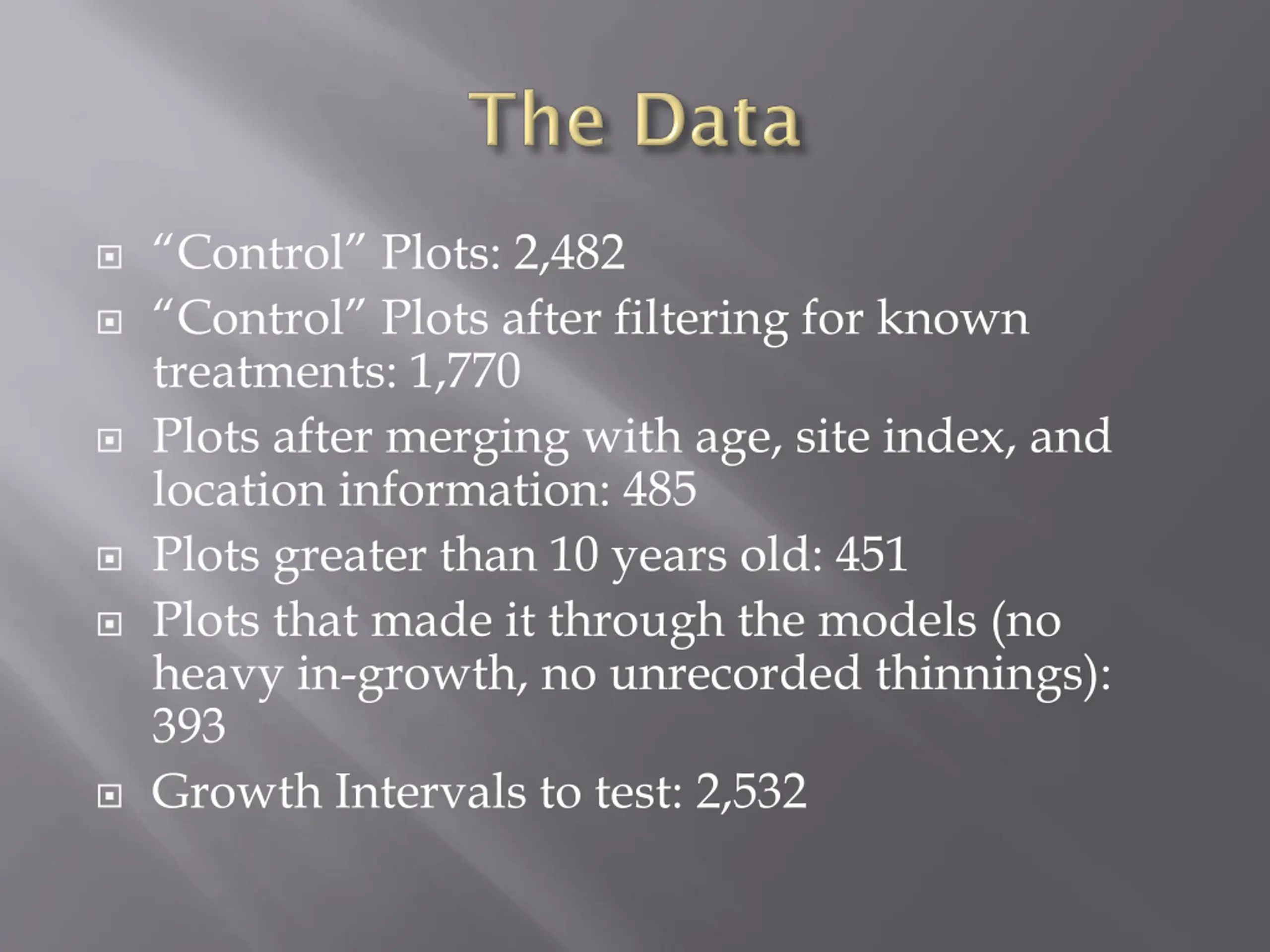Control Plots: 2,482 Control Plots after filtering for known treatments: 1,770 Plots after merging with age, site index, and location information: 485 Plots greater than 10 years old: 451 Plots that made it through the models (no heavy in-growth, no unrecorded thinnings): 393 Growth Intervals to test: 2,532