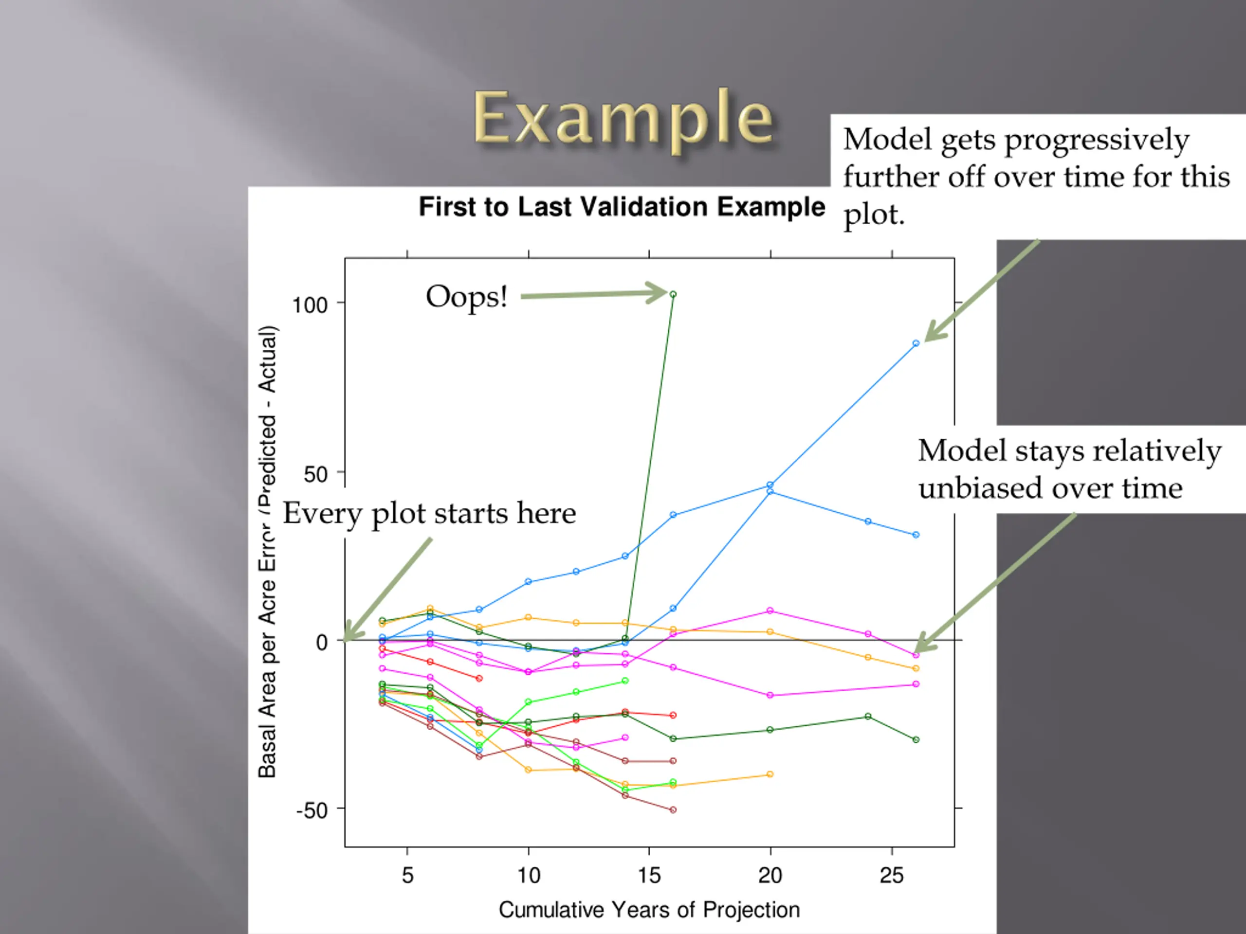 Model gets progressively further off over time for this plot. First to Last Validation Example Oops! 100 Basal Area per Acre Error (Predicted - Actual) Model stays relatively unbiased over time 50 Every plot starts here 0 -50 5 10 15 20 25 Cumulative Years of Projection