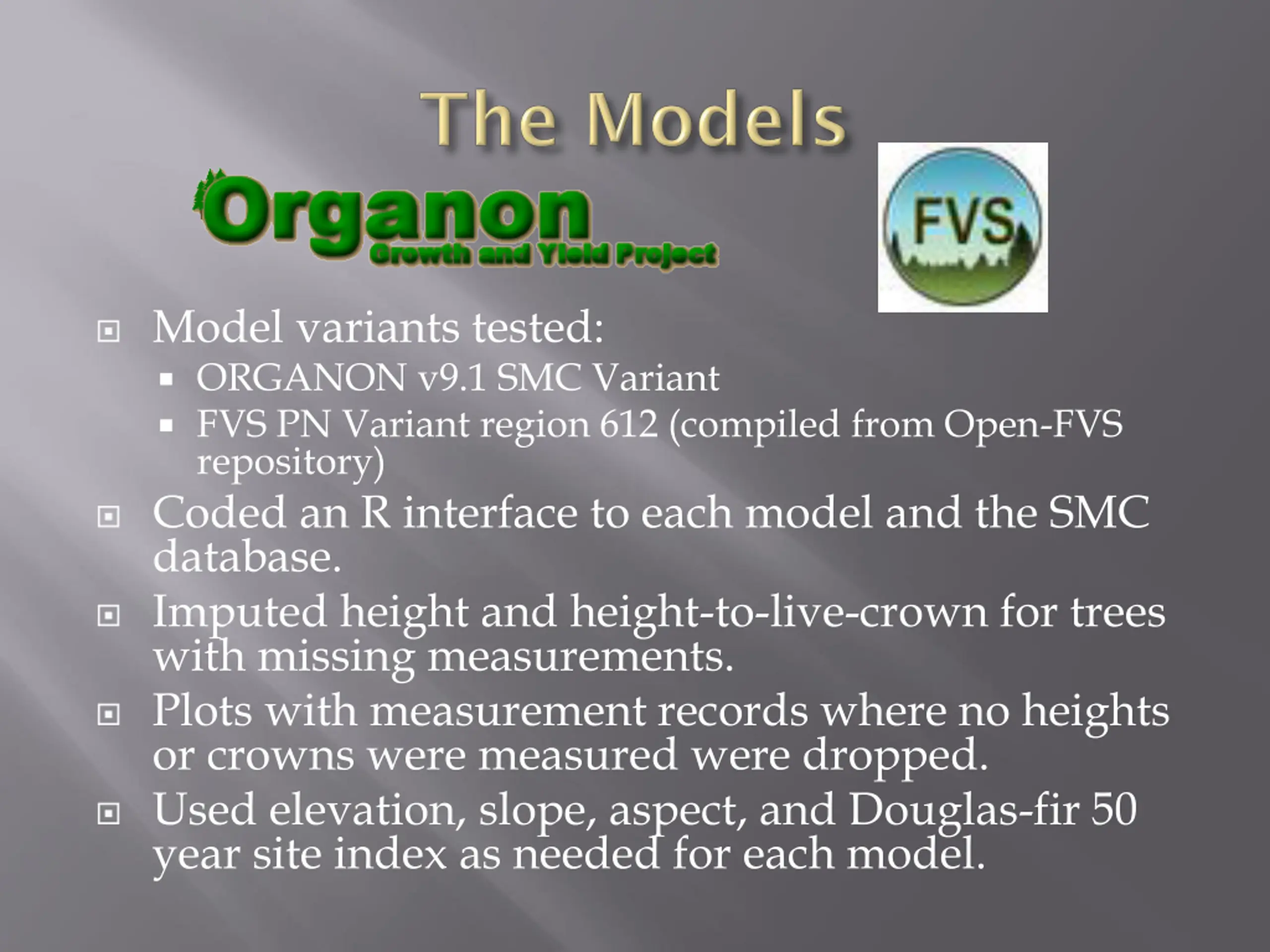 Model variants tested: ORGANON v9.1 SMC Variant FVS PN Variant region 612 (compiled from Open-FVS repository) Coded an R interface to each model and the SMC database. Imputed height and height-to-live-crown for trees with missing measurements. Plots with measurement records where no heights or crowns were measured were dropped. Used elevation, slope, aspect, and Douglas-fir 50 year site index as needed for each model.