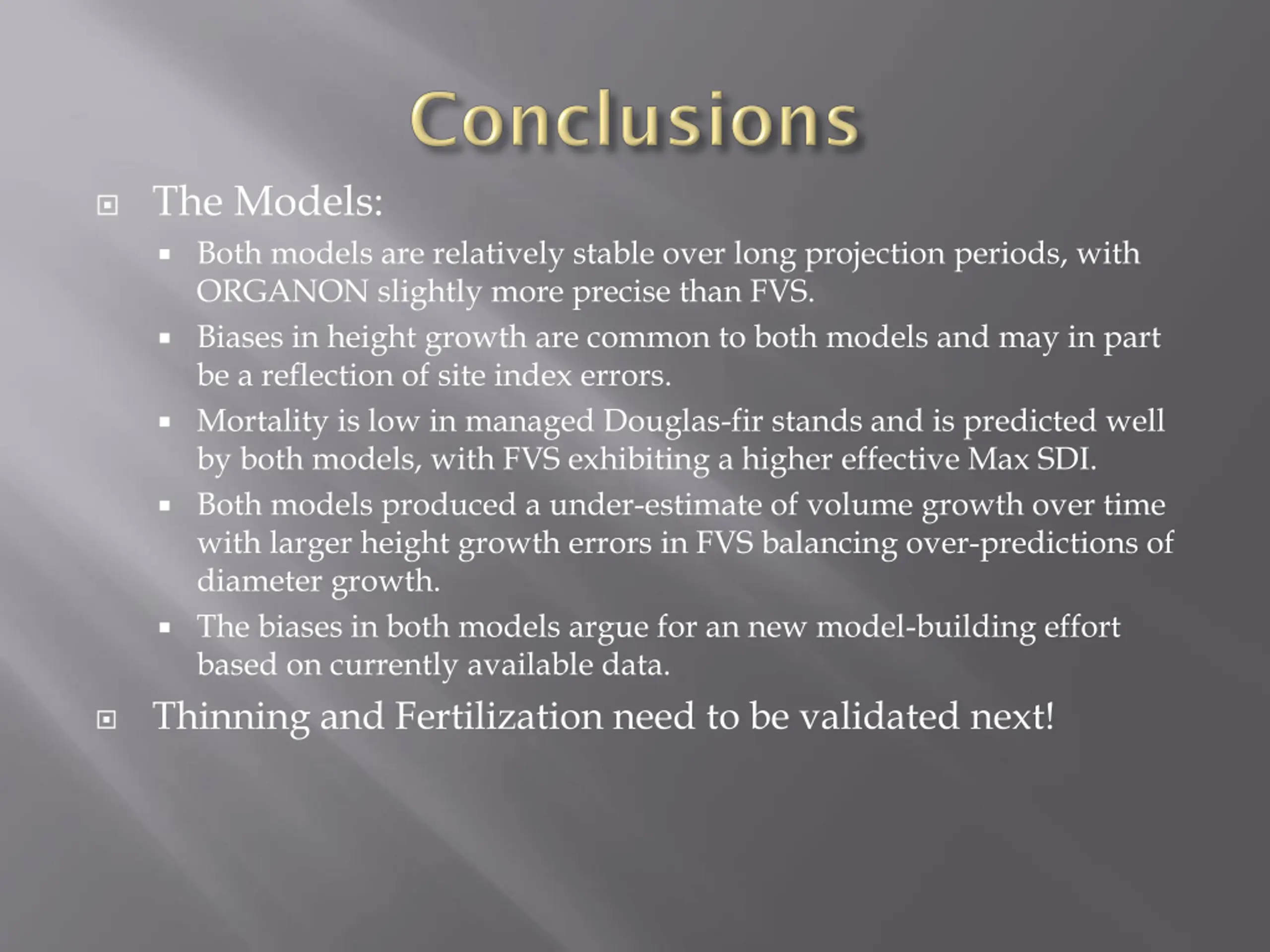 The Models: Both models are relatively stable over long projection periods, with ORGANON slightly more precise than FVS. Biases in height growth are common to both models and may in part be a reflection of site index errors. Mortality is low in managed Douglas-fir stands and is predicted well by both models, with FVS exhibiting a higher effective Max SDI. Both models produced a under-estimate of volume growth over time with larger height growth errors in FVS balancing over-predictions of diameter growth. The biases in both models argue for an new model-building effort based on currently available data. Thinning and Fertilization need to be validated next!