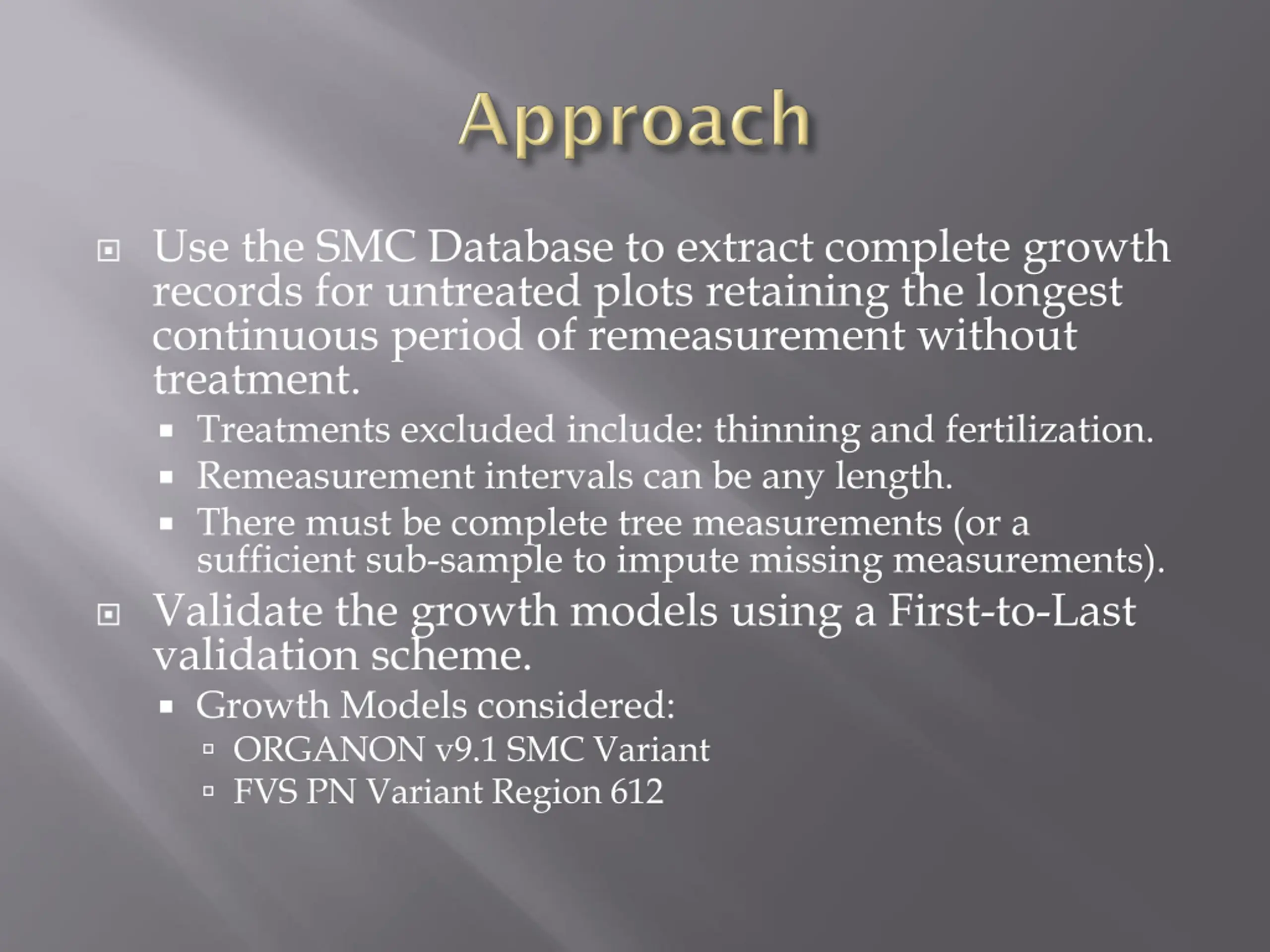 Use the SMC Database to extract complete growth records for untreated plots retaining the longest continuous period of remeasurement without treatment. Treatments excluded include: thinning and fertilization. Remeasurement intervals can be any length. There must be complete tree measurements (or a sufficient sub-sample to impute missing measurements). Validate the growth models using a First-to-Last validation scheme. Growth Models considered: ORGANON v9.1 SMC Variant FVS PN Variant Region 612