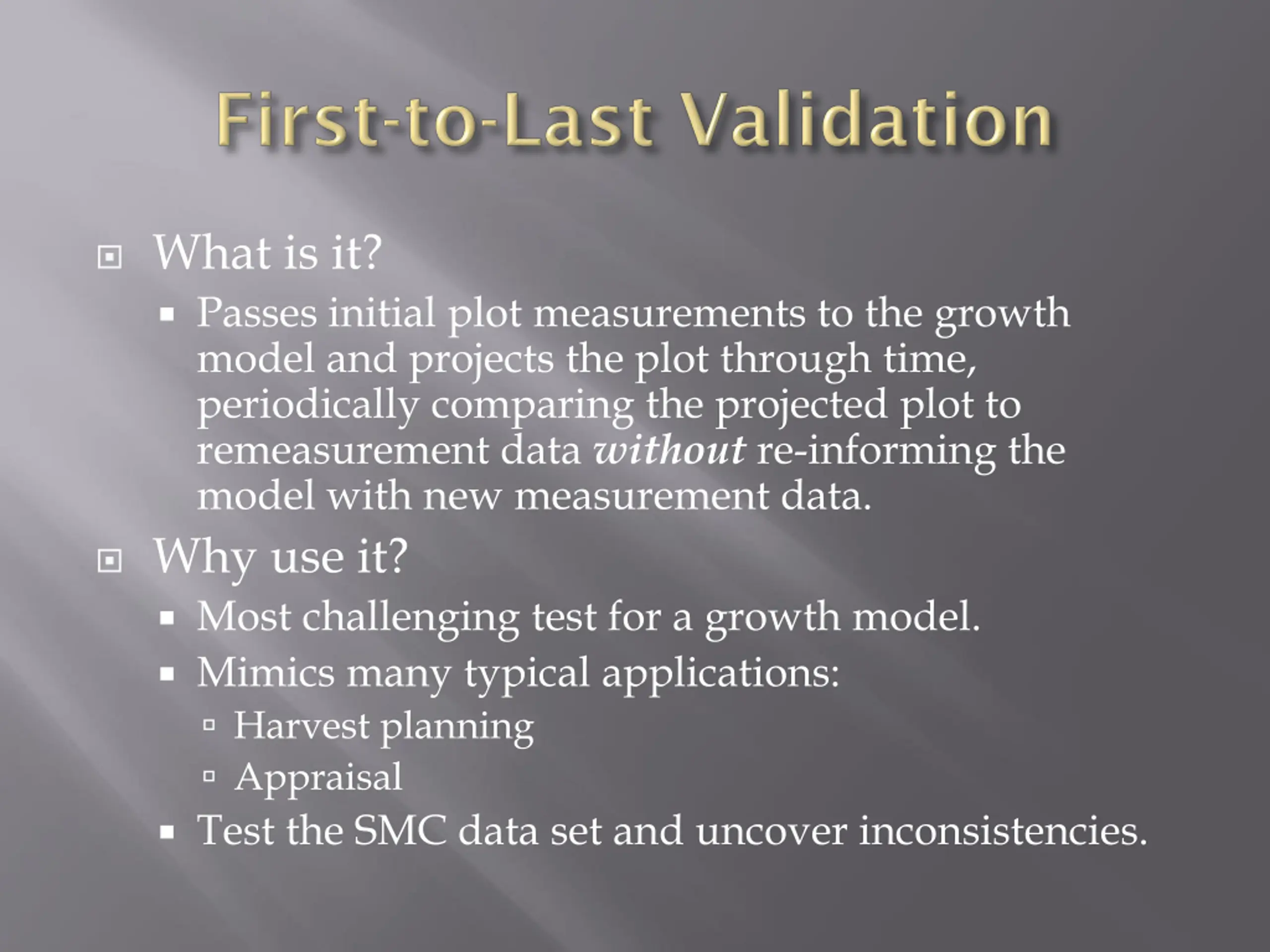 What is it? Passes initial plot measurements to the growth model and projects the plot through time, periodically comparing the projected plot to remeasurement data without re-informing the model with new measurement data. Why use it? Most challenging test for a growth model. Mimics many typical applications: Harvest planning Appraisal Test the SMC data set and uncover inconsistencies.