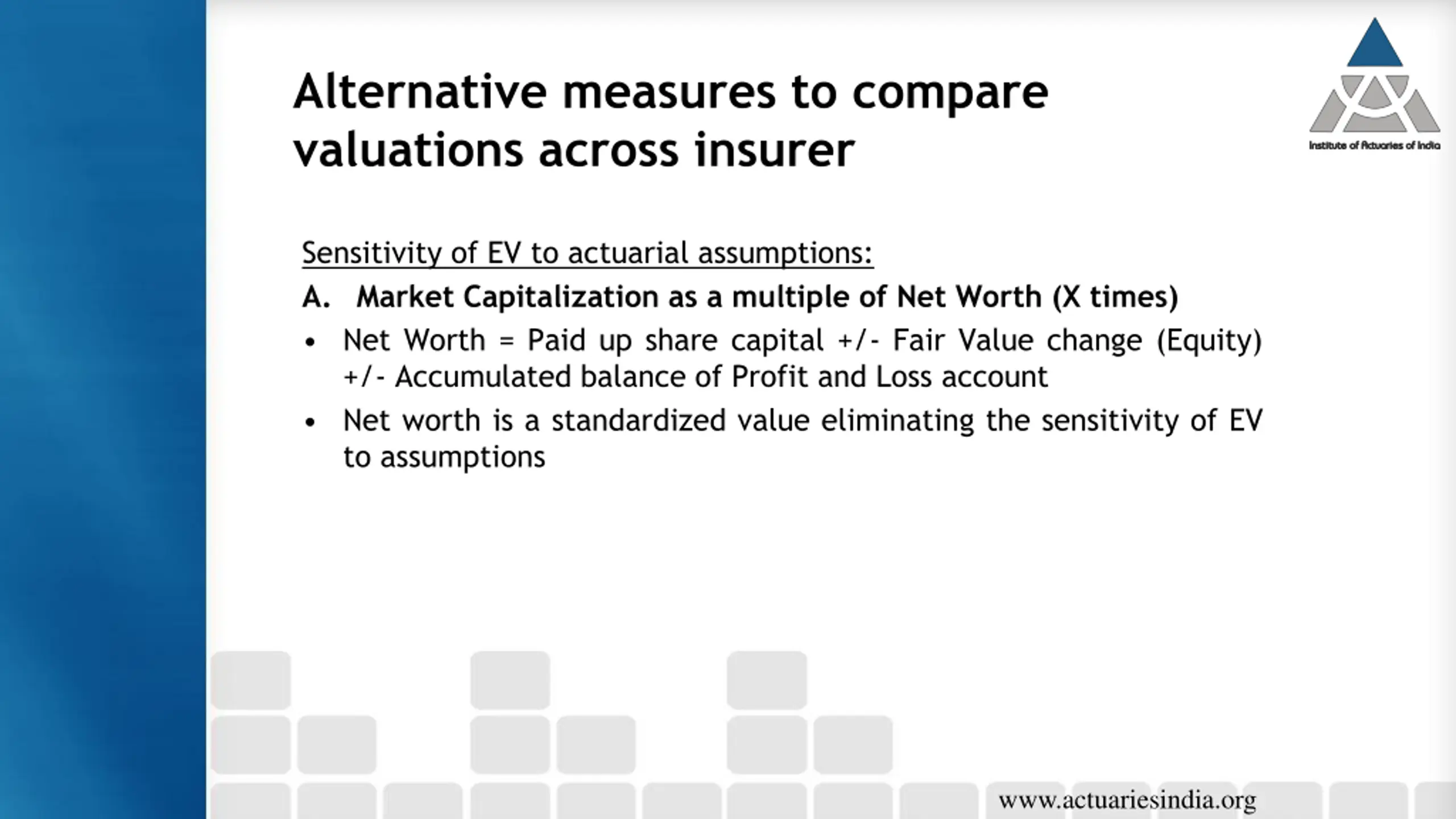 Alternative measures to compare valuations across insurer Sensitivity of EV to actuarial assumptions: A. Market Capitalization as a multiple of Net Worth (X times) Net Worth = Paid up share capital +/- Fair Value change (Equity) +/- Accumulated balance of Profit and Loss account Net worth is a standardized value eliminating the sensitivity of EV to assumptions www.actuariesindia.org