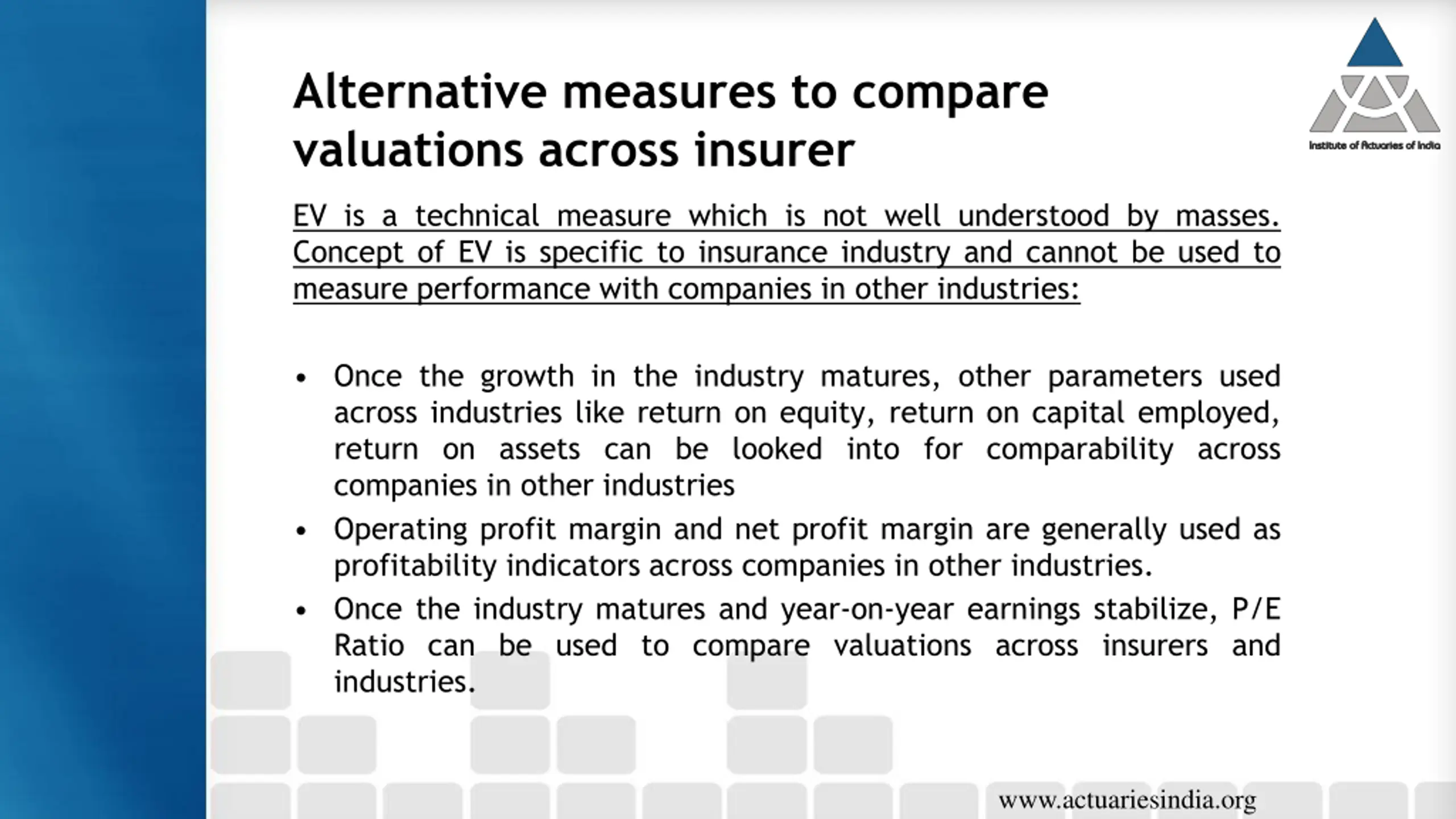 Alternative measures to compare valuations across insurer EV is a technical measure which is not well understood by masses. Concept of EV is specific to insurance industry and cannot be used to measure performance with companies in other industries: Once the growth in the industry matures, other parameters used across industries like return on equity, return on capital employed, return on assets can be looked into for comparability across companies in other industries Operating profit margin and net profit margin are generally used as profitability indicators across companies in other industries. Once the industry matures and year-on-year earnings stabilize, P/E Ratio can be used to compare valuations across insurers and industries. www.actuariesindia.org