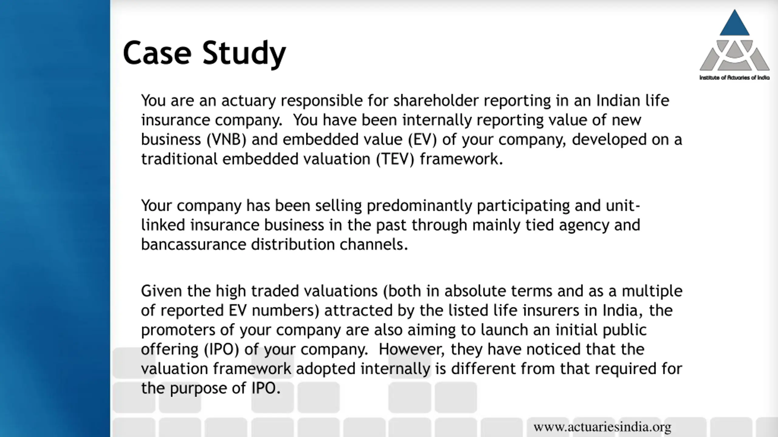 Case Study You are an actuary responsible for shareholder reporting in an Indian life insurance company. You have been internally reporting value of new business (VNB) and embedded value (EV) of your company, developed on a traditional embedded valuation (TEV) framework. Your company has been selling predominantly participating and unit- linked insurance business in the past through mainly tied agency and bancassurance distribution channels. Given the high traded valuations (both in absolute terms and as a multiple of reported EV numbers) attracted by the listed life insurers in India, the promoters of your company are also aiming to launch an initial public offering (IPO) of your company. However, they have noticed that the valuation framework adopted internally is different from that required for the purpose of IPO. www.actuariesindia.org
