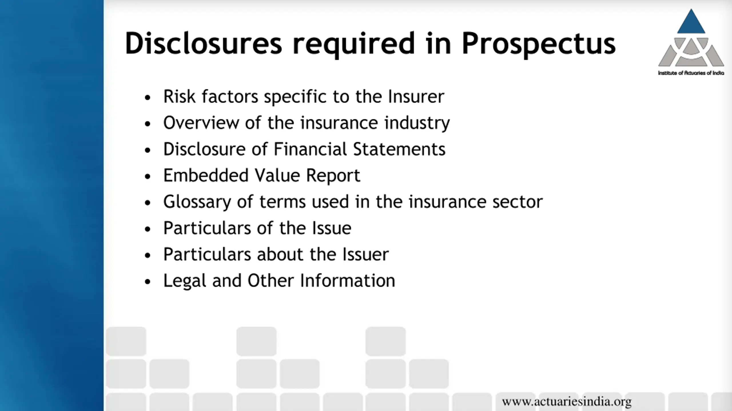 Disclosures required in Prospectus Risk factors specific to the Insurer Overview of the insurance industry Disclosure of Financial Statements Embedded Value Report Glossary of terms used in the insurance sector Particulars of the Issue Particulars about the Issuer Legal and Other Information www.actuariesindia.org