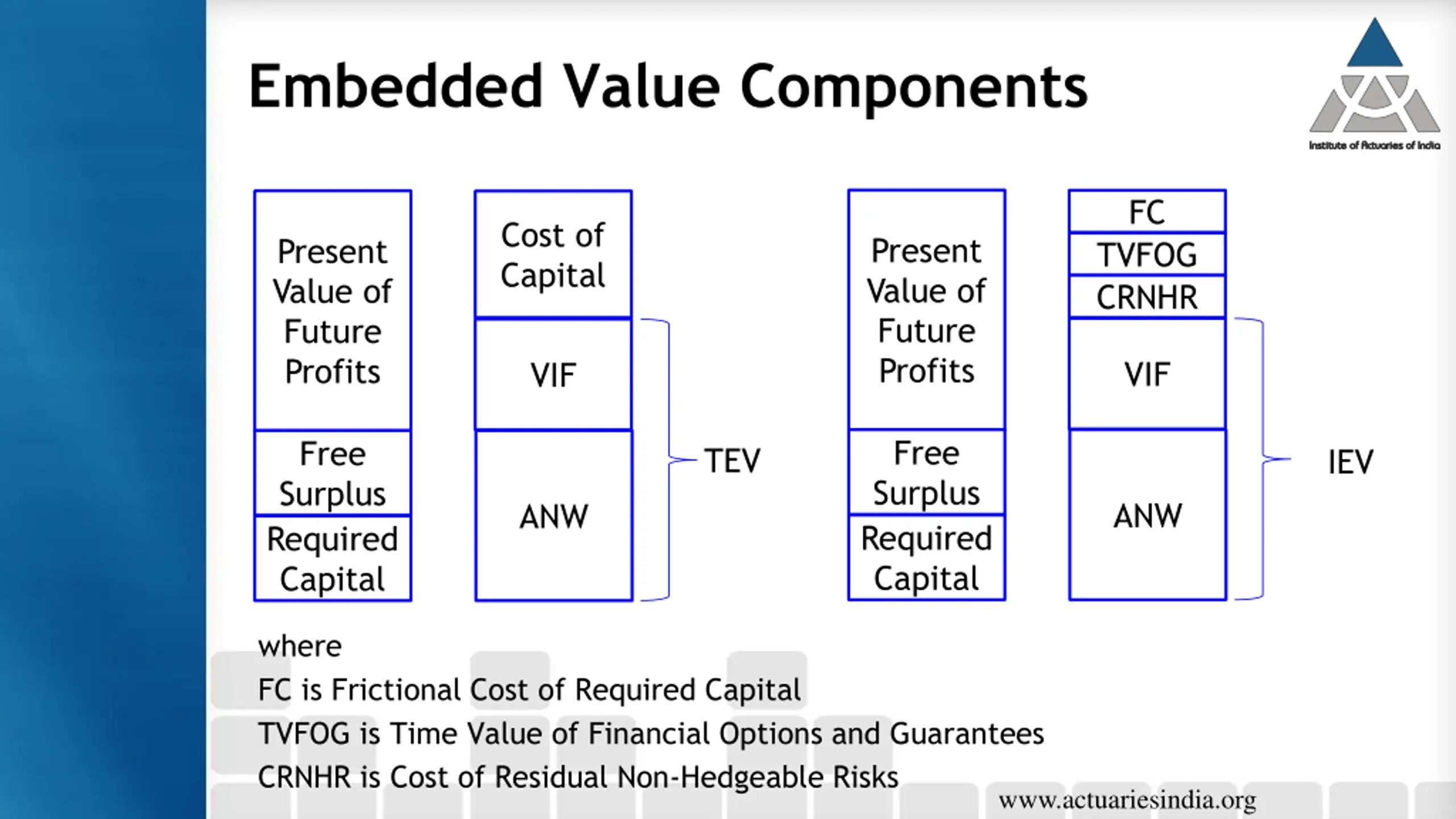 Embedded Value Components FC Cost of Capital Present Value of Future Profits Present Value of Future Profits TVFOG CRNHR VIF VIF Free Surplus Required Capital Free Surplus Required Capital TEV IEV ANW ANW where FC is Frictional Cost of Required Capital TVFOG is Time Value of Financial Options and Guarantees CRNHR is Cost of Residual Non-Hedgeable Risks www.actuariesindia.org