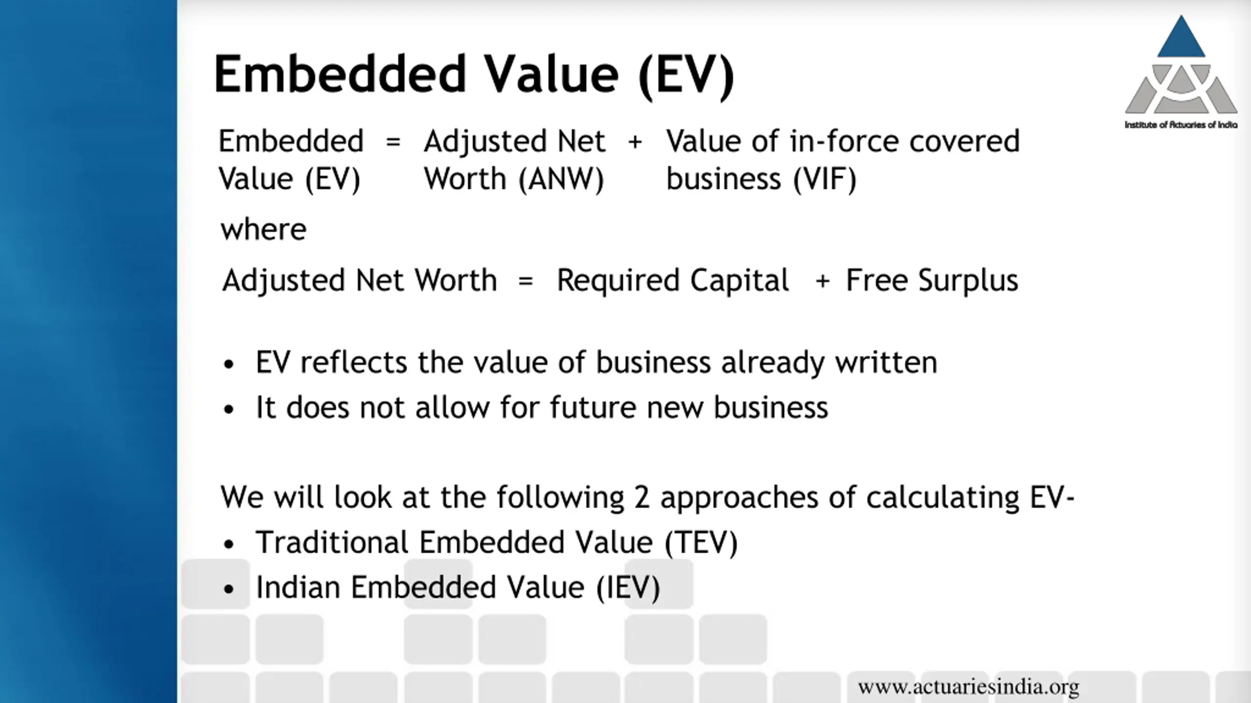 Embedded Value (EV) Embedded Value (EV) = Adjusted Net Worth (ANW) + Value of in-force covered business (VIF) where Adjusted Net Worth = Required Capital + Free Surplus EV reflects the value of business already written It does not allow for future new business We will look at the following 2 approaches of calculating EV- Traditional Embedded Value (TEV) Indian Embedded Value (IEV) www.actuariesindia.org