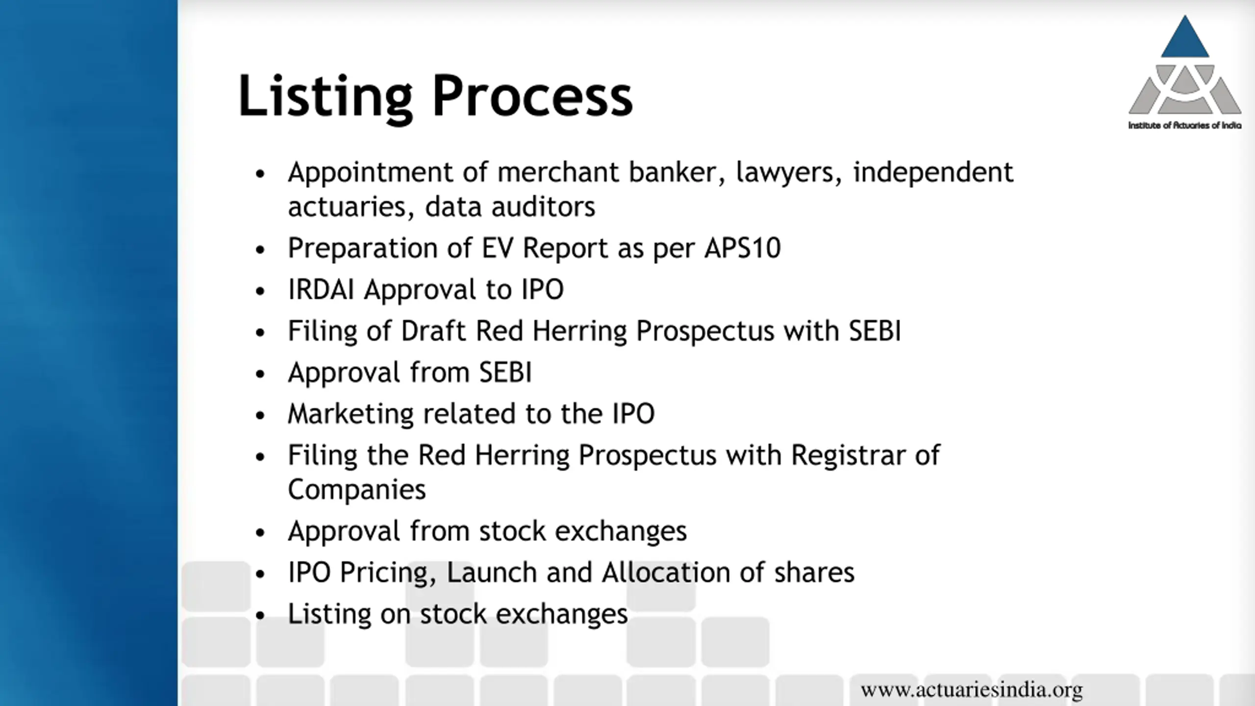 Listing Process Appointment of merchant banker, lawyers, independent actuaries, data auditors Preparation of EV Report as per APS10 IRDAI Approval to IPO Filing of Draft Red Herring Prospectus with SEBI Approval from SEBI Marketing related to the IPO Filing the Red Herring Prospectus with Registrar of Companies Approval from stock exchanges IPO Pricing, Launch and Allocation of shares Listing on stock exchanges www.actuariesindia.org