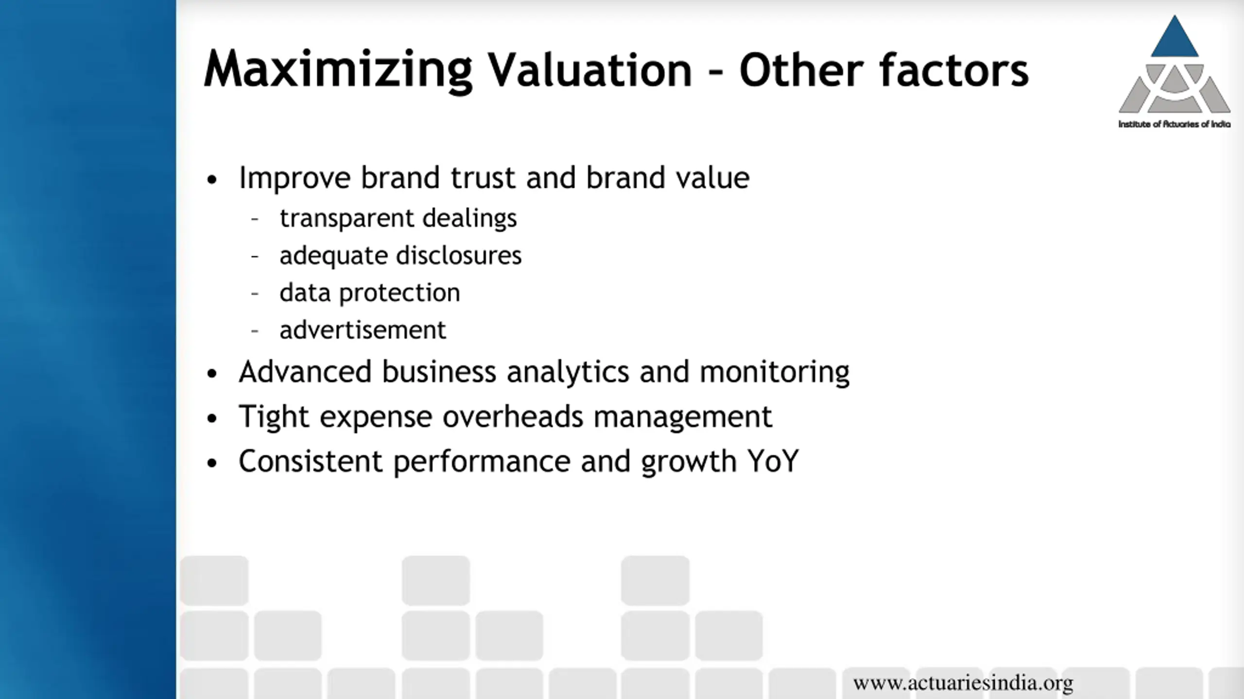 Maximizing Valuation Other factors Improve brand trust and brand value transparent dealings adequate disclosures data protection advertisement Advanced business analytics and monitoring Tight expense overheads management Consistent performance and growth YoY www.actuariesindia.org