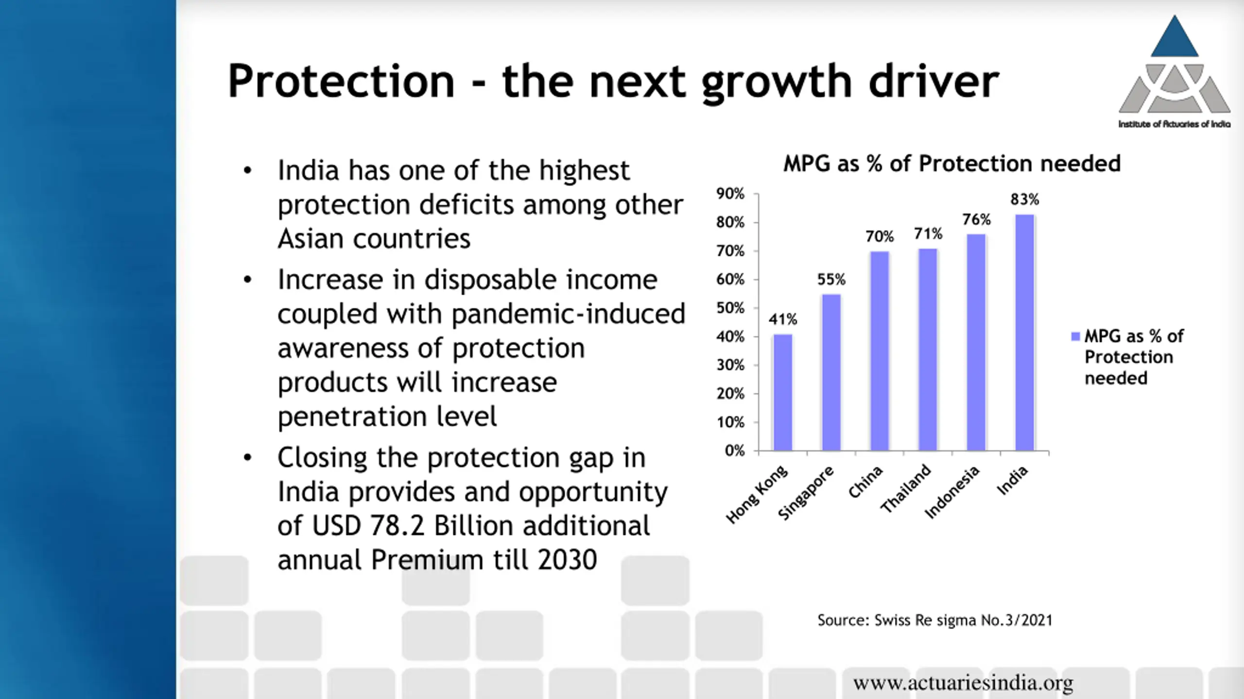 Protection - the next growth driver MPG as % of Protection needed India has one of the highest protection deficits among other Asian countries Increase in disposable income coupled with pandemic-induced awareness of protection products will increase penetration level Closing the protection gap in India provides and opportunity of USD 78.2 Billion additional annual Premium till 2030 90% 83% 76% 80% 71% 70% 70% 60% 55% 50% 41% MPG as % of Protection needed 40% 30% 20% 10% 0% Source: Swiss Re sigma No.3/2021 www.actuariesindia.org