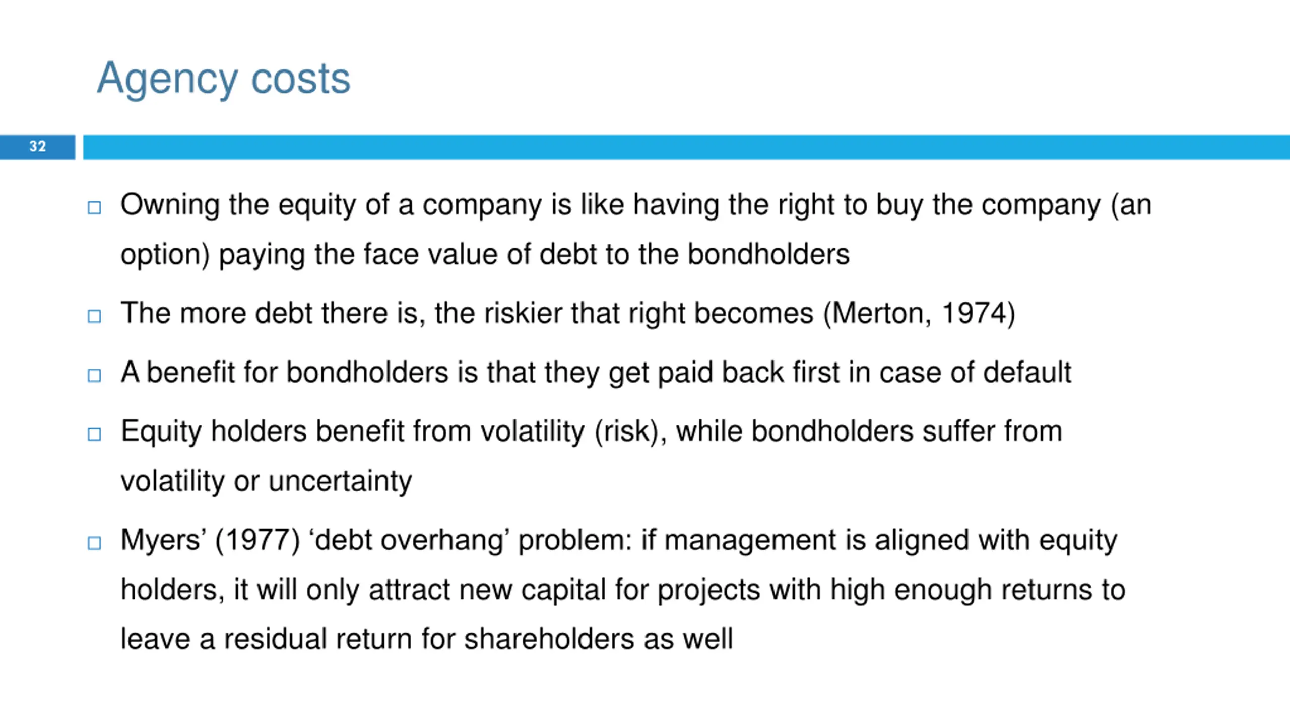 Agency costs 32 Owning the equity of a company is like having the right to buy the company (an option) paying the face value of debt to the bondholders The more debt there is, the riskier that right becomes (Merton, 1974) A benefit for bondholders is that they get paid back first in case of default Equity holders benefit from volatility (risk), while bondholders suffer from volatility or uncertainty Myers (1977) debt overhang problem: if management is aligned with equity holders, it will only attract new capital for projects with high enough returns to leave a residual return for shareholders as well