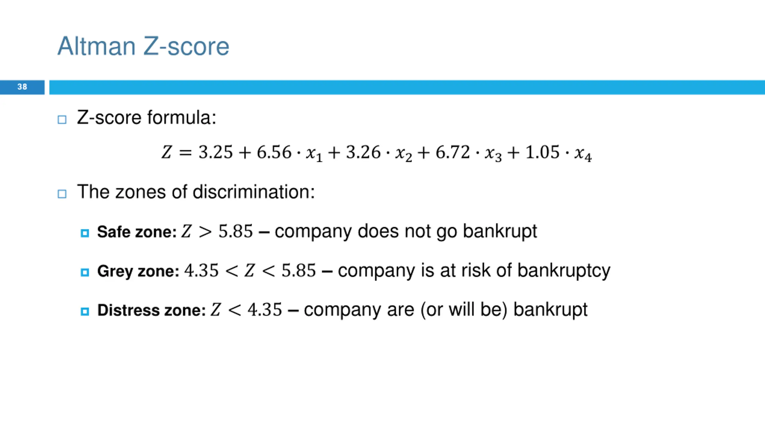 Altman Z-score 38 Z-score formula: ? = 3.25 + 6.56 ?1+ 3.26 ?2+ 6.72 ?3+ 1.05 ?4 The zones of discrimination: Safe zone: ? > 5.85 company does not go bankrupt Grey zone: 4.35 < ? < 5.85 company is at risk of bankruptcy Distress zone: ? < 4.35 company are (or will be) bankrupt