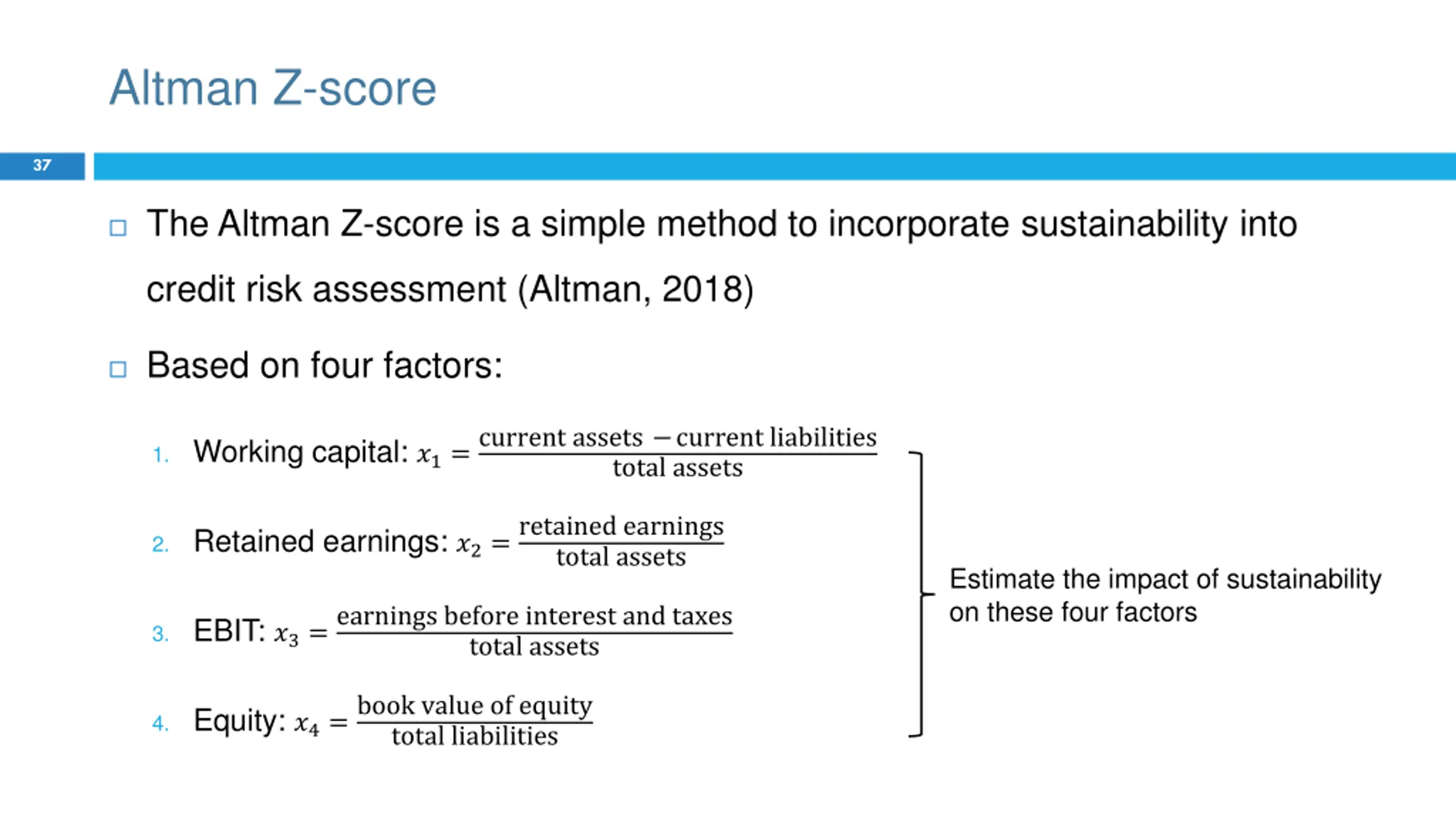 Altman Z-score 37 The Altman Z-score is a simple method to incorporate sustainability into credit risk assessment (Altman, 2018) Based on four factors: 1. Working capital: ?1=current assets current liabilities total assets 2. Retained earnings: ?2=retained earnings total assets Estimate the impact of sustainability on these four factors 3. EBIT: ?3=earnings before interest and taxes total assets 4. Equity: ?4=book value of equity total liabilities