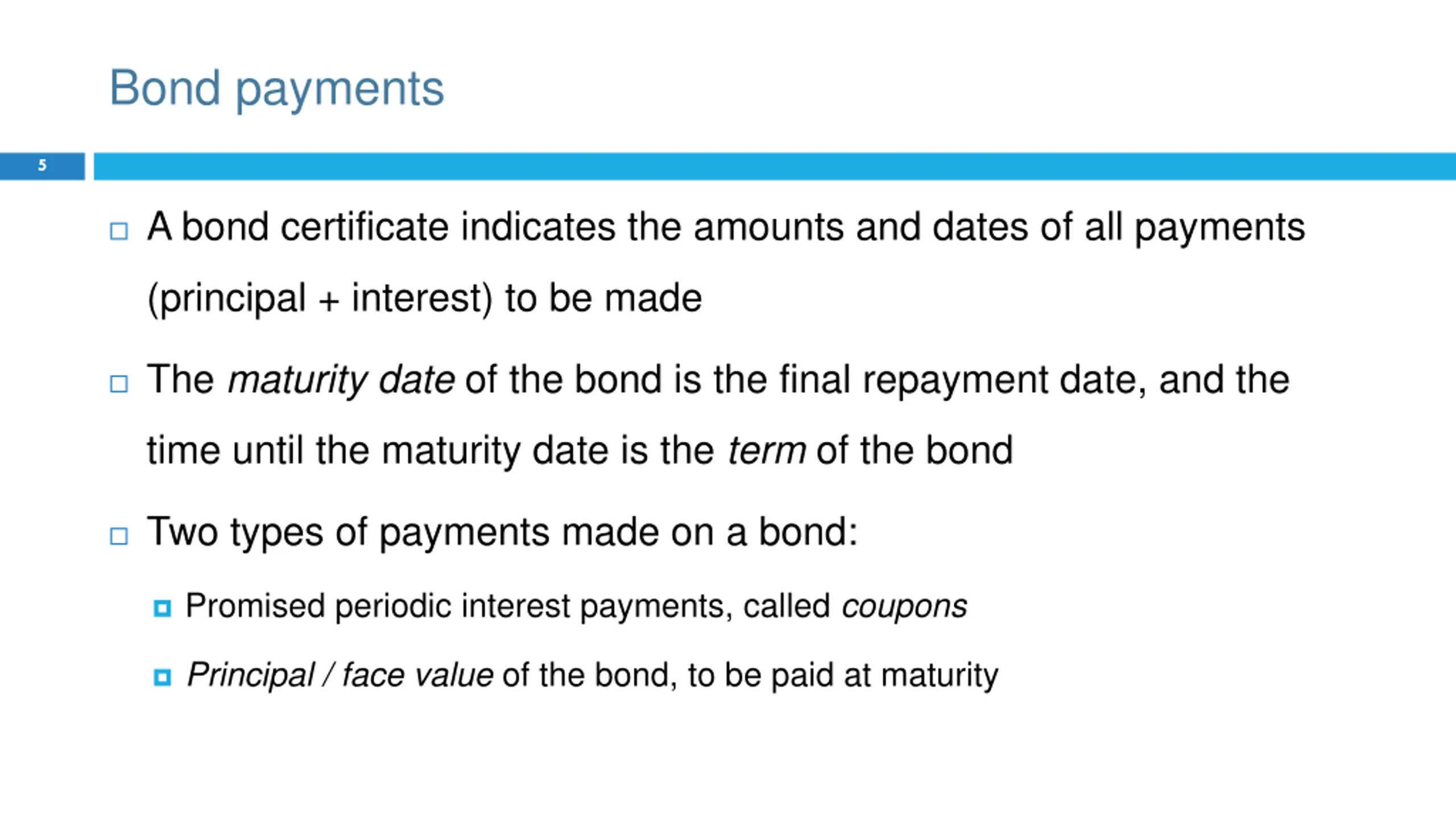 Bond payments 5 A bond certificate indicates the amounts and dates of all payments (principal + interest) to be made The maturity date of the bond is the final repayment date, and the time until the maturity date is the term of the bond Two types of payments made on a bond: Promised periodic interest payments, called coupons Principal / face value of the bond, to be paid at maturity