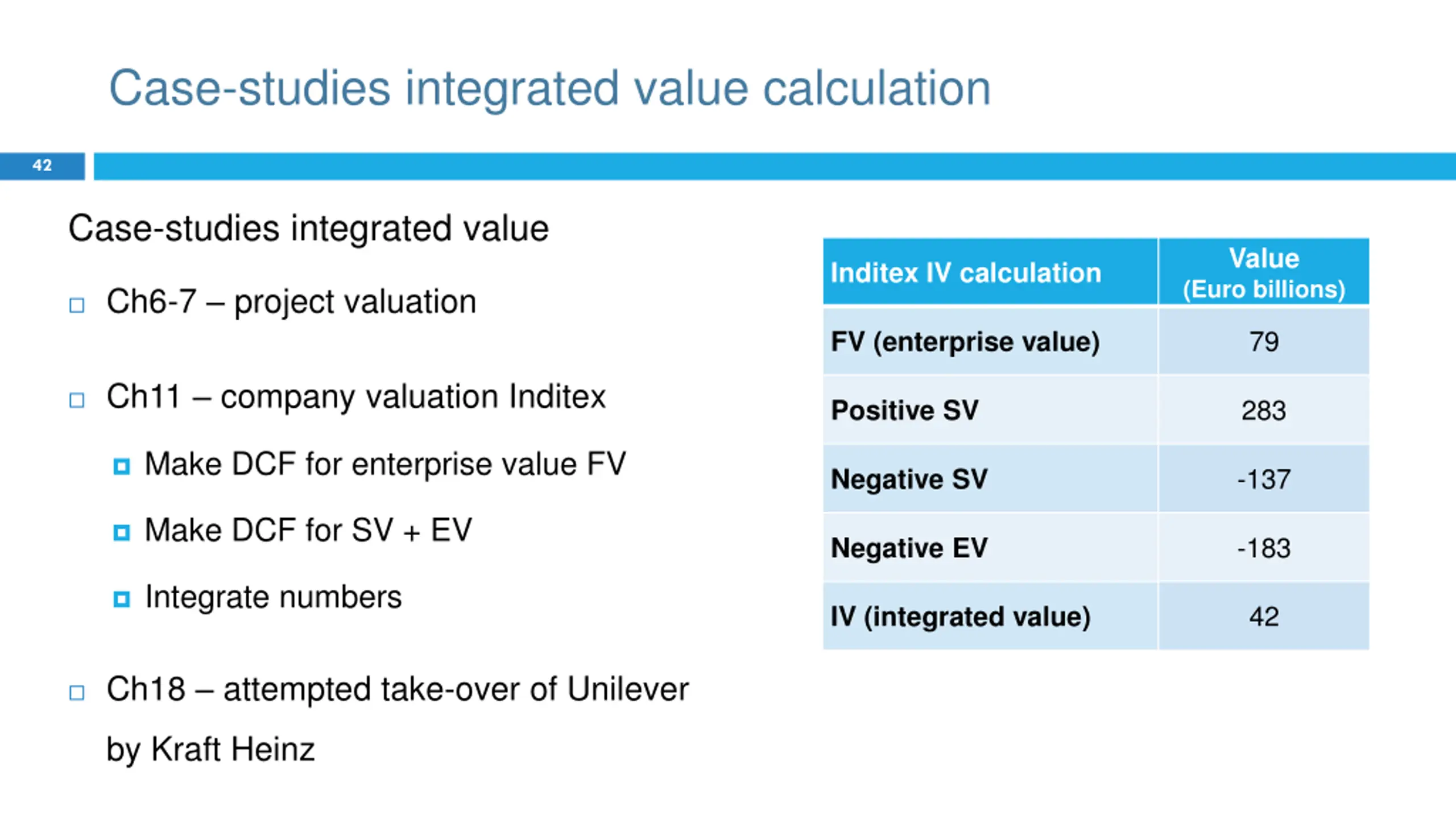 Case-studies integrated value calculation 42 Case-studies integrated value Value Inditex IV calculation (Euro billions) Ch6-7 project valuation 79 FV (enterprise value) Ch11 company valuation Inditex 283 Positive SV Make DCF for enterprise value FV -137 Negative SV Make DCF for SV + EV -183 Negative EV Integrate numbers 42 IV (integrated value) Ch18 attempted take-over of Unilever by Kraft Heinz