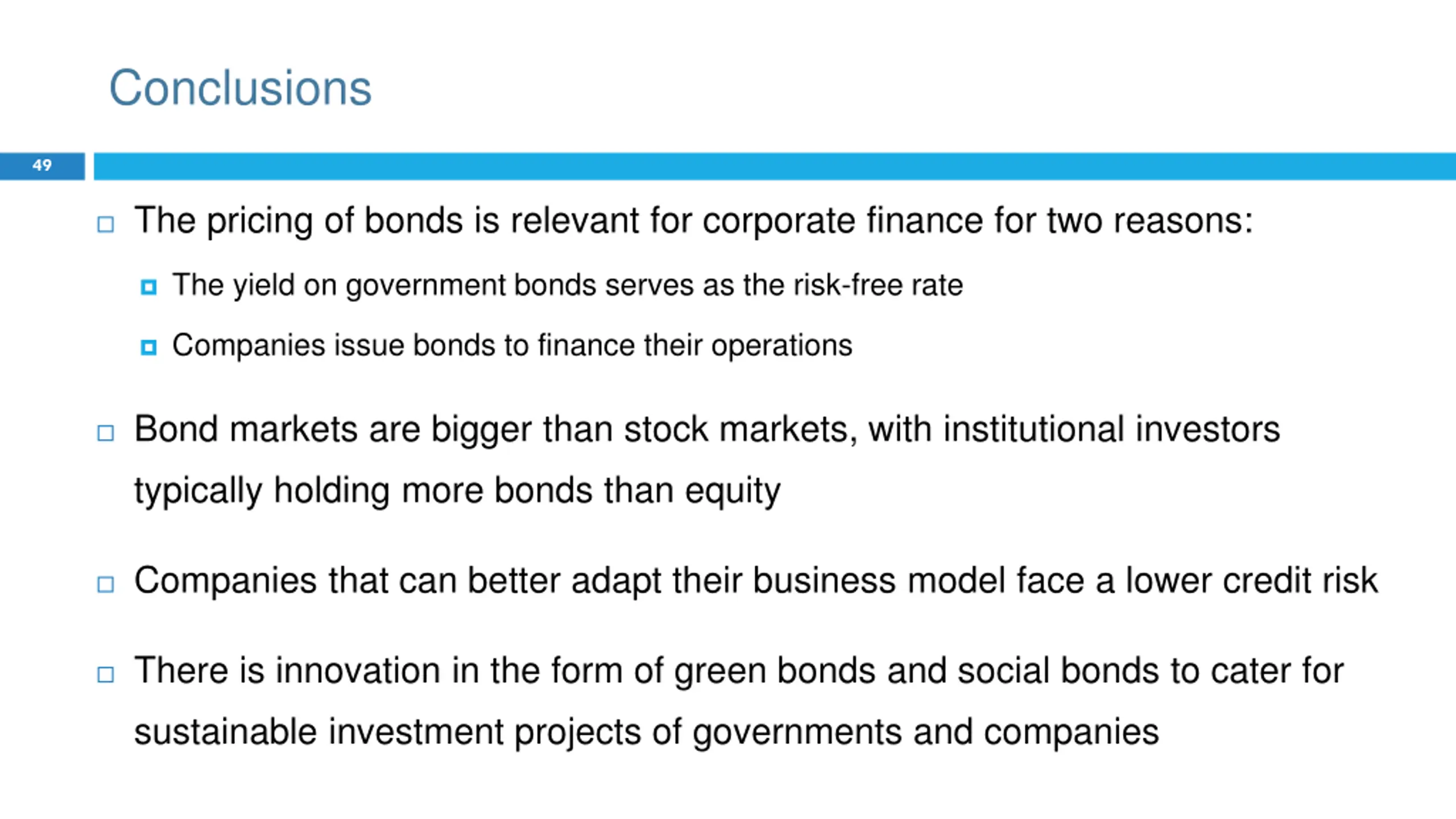Conclusions 49 The pricing of bonds is relevant for corporate finance for two reasons: The yield on government bonds serves as the risk-free rate Companies issue bonds to finance their operations Bond markets are bigger than stock markets, with institutional investors typically holding more bonds than equity Companies that can better adapt their business model face a lower credit risk There is innovation in the form of green bonds and social bonds to cater for sustainable investment projects of governments and companies