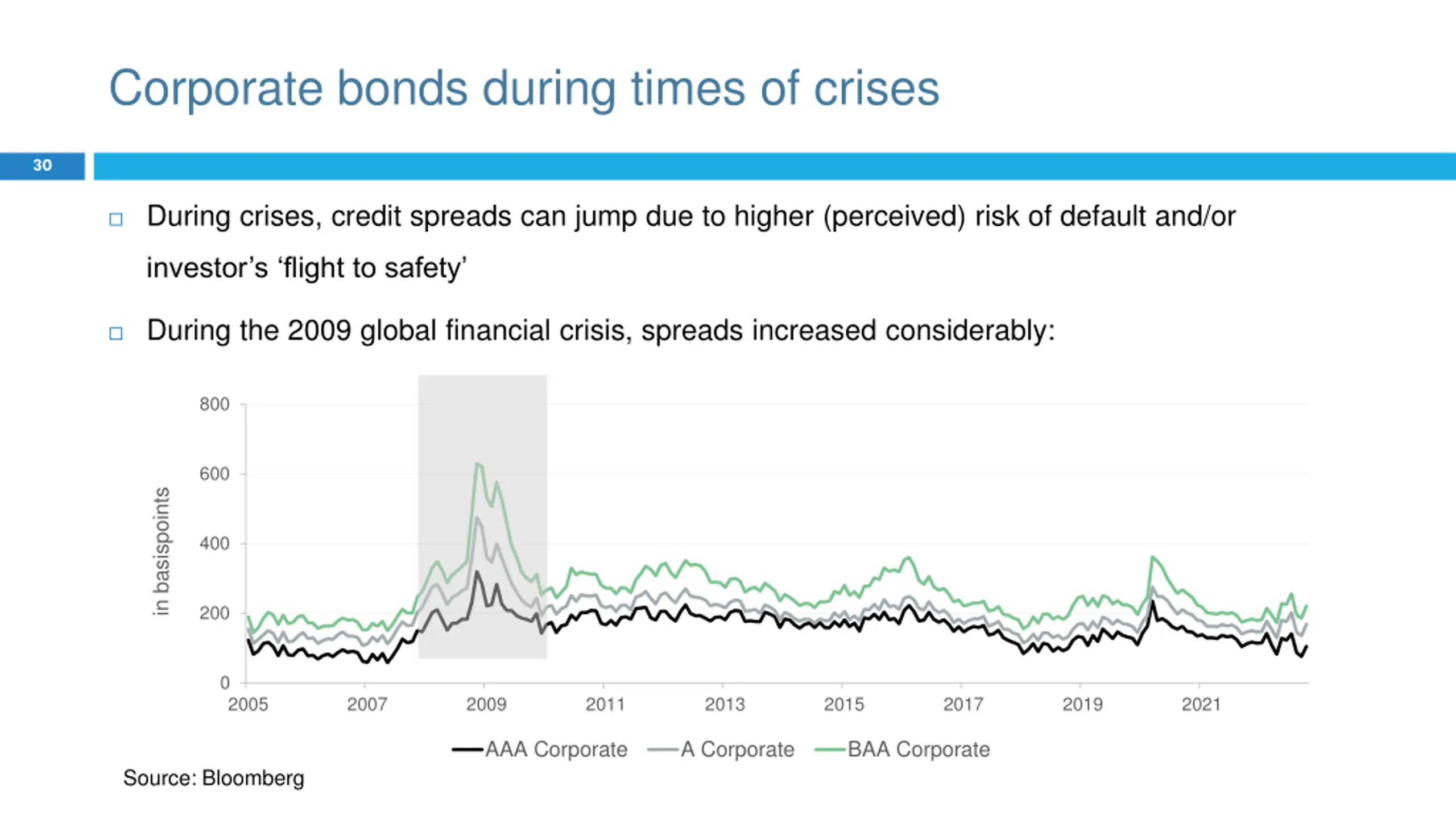 Corporate bonds during times of crises 30 During crises, credit spreads can jump due to higher (perceived) risk of default and/or investor s flight to safety During the 2009 global financial crisis, spreads increased considerably: 800 600 in basispoints 400 200 0 2005 2007 2009 2011 2013 2015 2017 2019 2021 AAA Corporate A Corporate BAA Corporate Source: Bloomberg