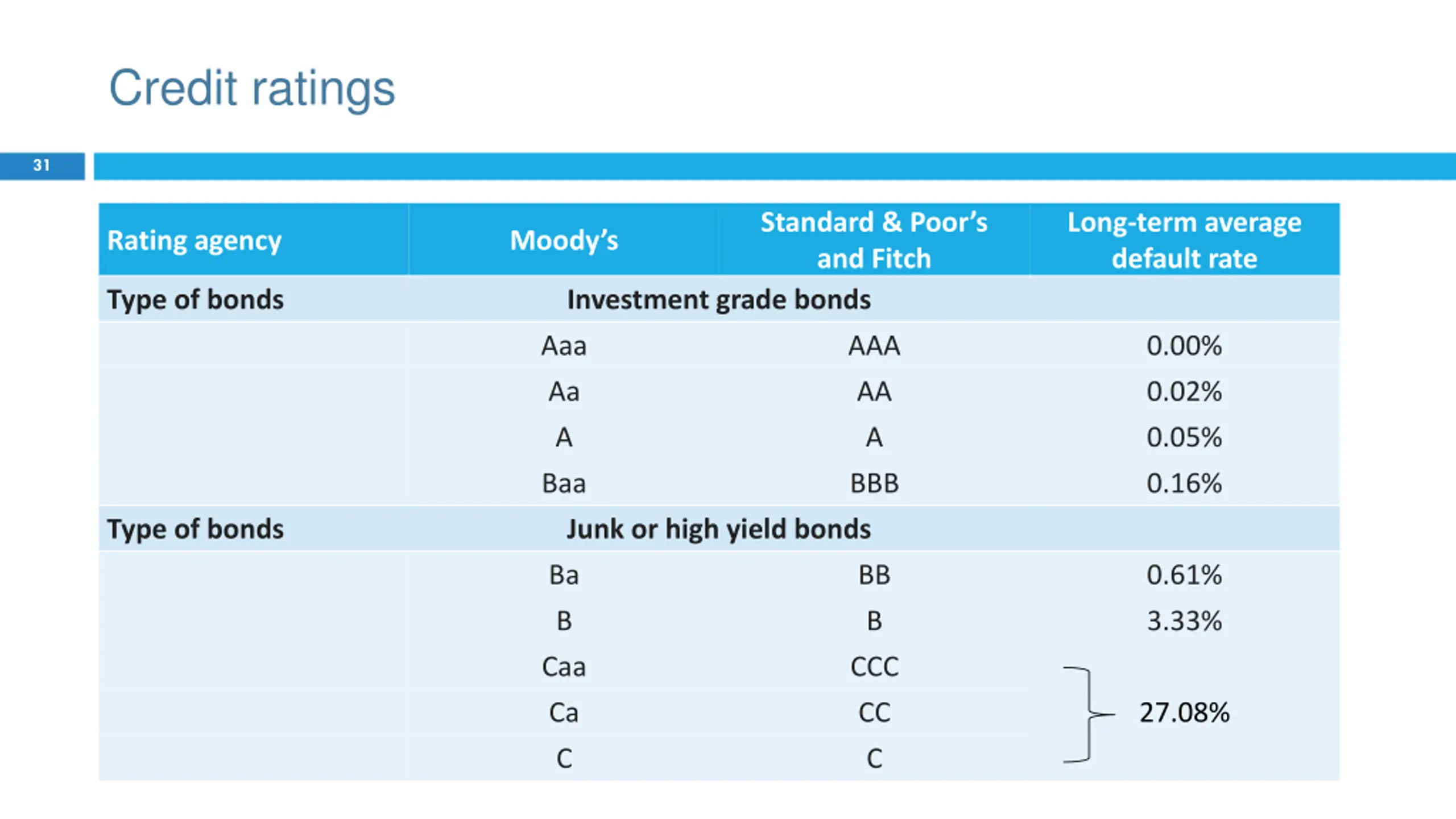 Credit ratings 31 Standard & Poor s and Fitch Long-term average default rate Rating agency Moody s Type of bonds Investment grade bonds Aaa AAA 0.00% Aa AA 0.02% A A 0.05% Baa BBB 0.16% Type of bonds Junk or high yield bonds Ba BB 0.61% B B 3.33% Caa CCC Ca CC 27.08% C C