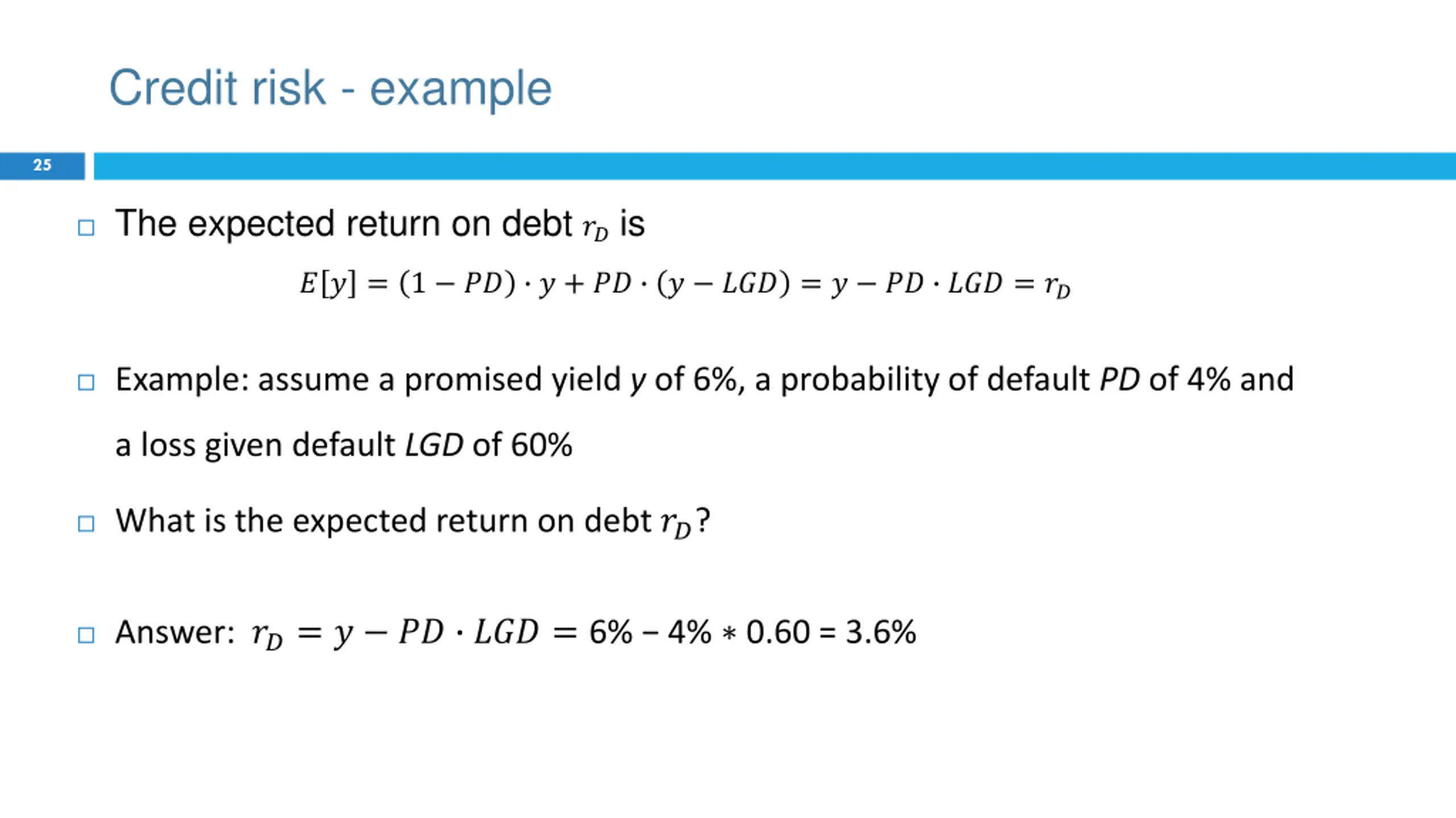 Credit risk - example 25 The expected return on debt ??is ? ? = 1 ?? ? + ?? ? ??? = ? ?? ??? = ?? Example: assume a promised yield y of 6%, a probability of default PD of 4% and a loss given default LGD of 60% What is the expected return on debt ??? Answer: ??= ? ?? ??? = 6% 4% 0.60 = 3.6%