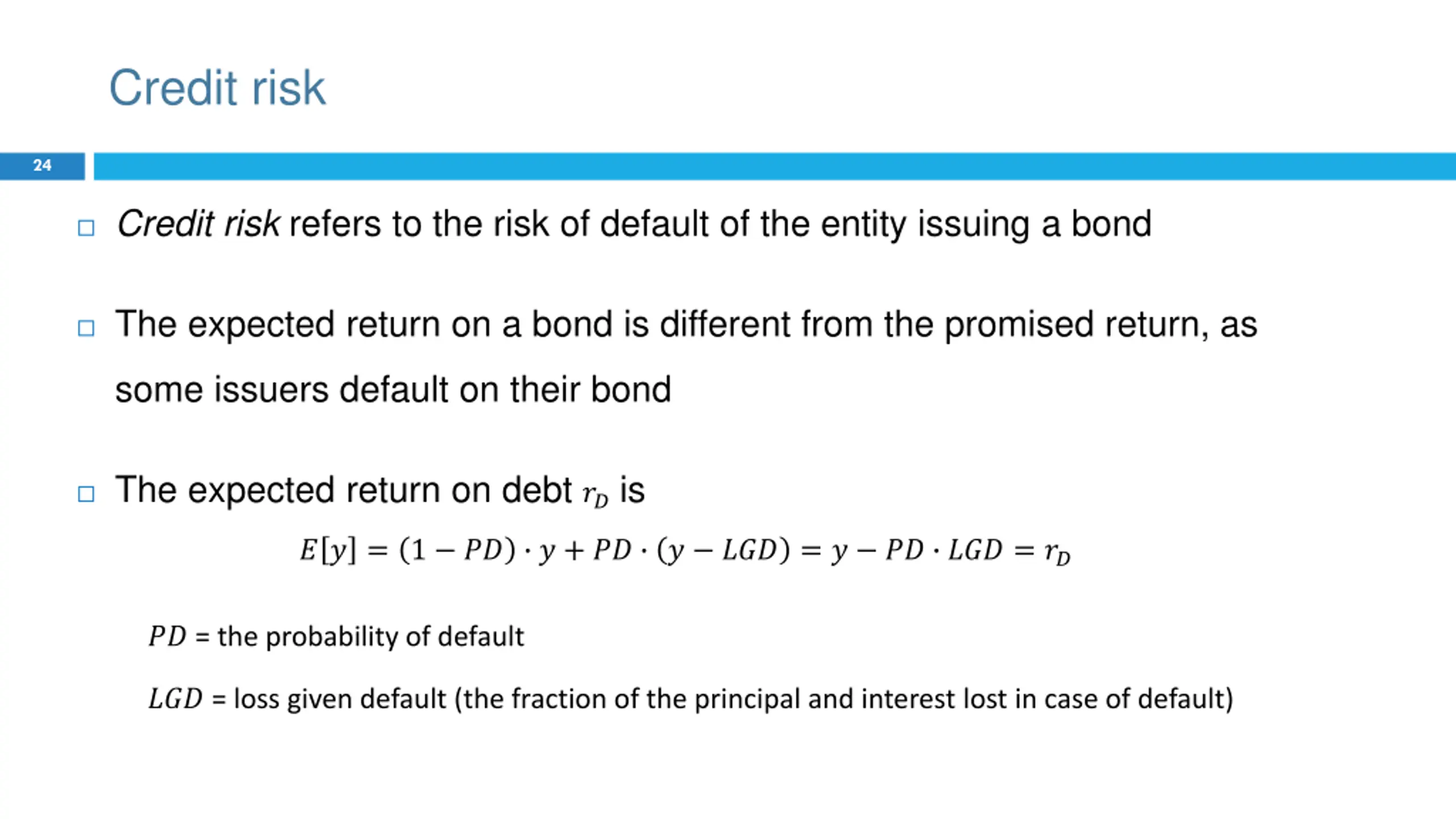 Credit risk 24 Credit risk refers to the risk of default of the entity issuing a bond The expected return on a bond is different from the promised return, as some issuers default on their bond The expected return on debt ??is ? ? = 1 ?? ? + ?? ? ??? = ? ?? ??? = ?? ?? = the probability of default ??? = loss given default (the fraction of the principal and interest lost in case of default)