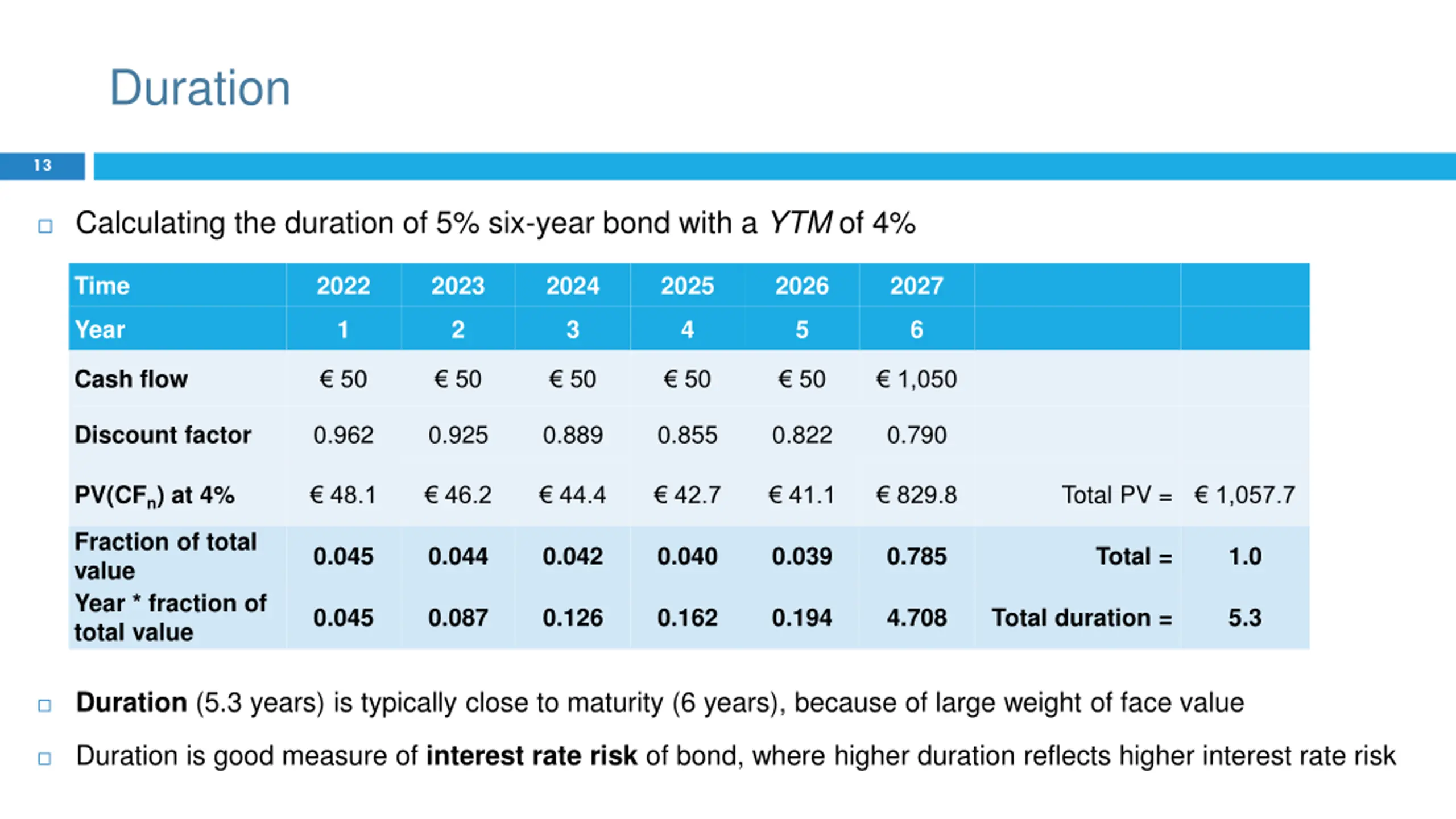 Interest rate changes 12 As interest rates change, bond prices move along with them The effect of interest rate changes is larger for bonds with longer terms The duration of a bond is the sensitivity of a bond s price to changes in interest rates, and the weighted average of the time-length of cash payments The time-length is the number of future years n = 1, 2, 3, .., until maturity N Duration = 1 ?? ??1 + 2 ?? ??2 + + ? ??(???) ?? ?? ?? The weight for each year is the present value ??(???) divided by the total present value ??