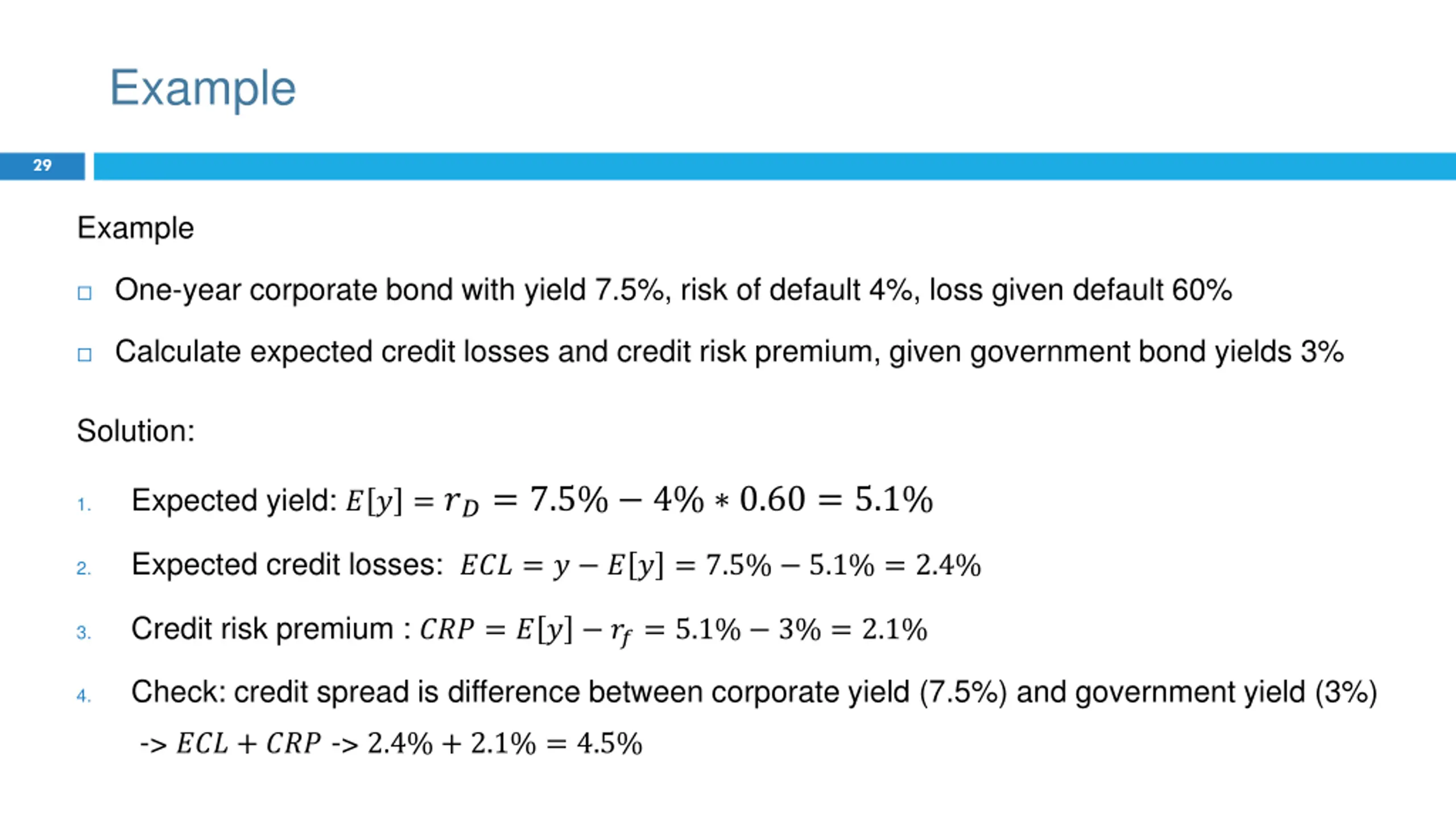 Example 29 Example One-year corporate bond with yield 7.5%, risk of default 4%, loss given default 60% Calculate expected credit losses and credit risk premium, given government bond yields 3% Solution: Expected yield: ? ? = ??= 7.5% 4% 0.60 = 5.1% 1. Expected credit losses: ??? = ? ? ? = 7.5% 5.1% = 2.4% 2. Credit risk premium : ??? = ? ? ??= 5.1% 3% = 2.1% 3. Check: credit spread is difference between corporate yield (7.5%) and government yield (3%) 4. -> ??? + ??? -> 2.4% + 2.1% = 4.5%