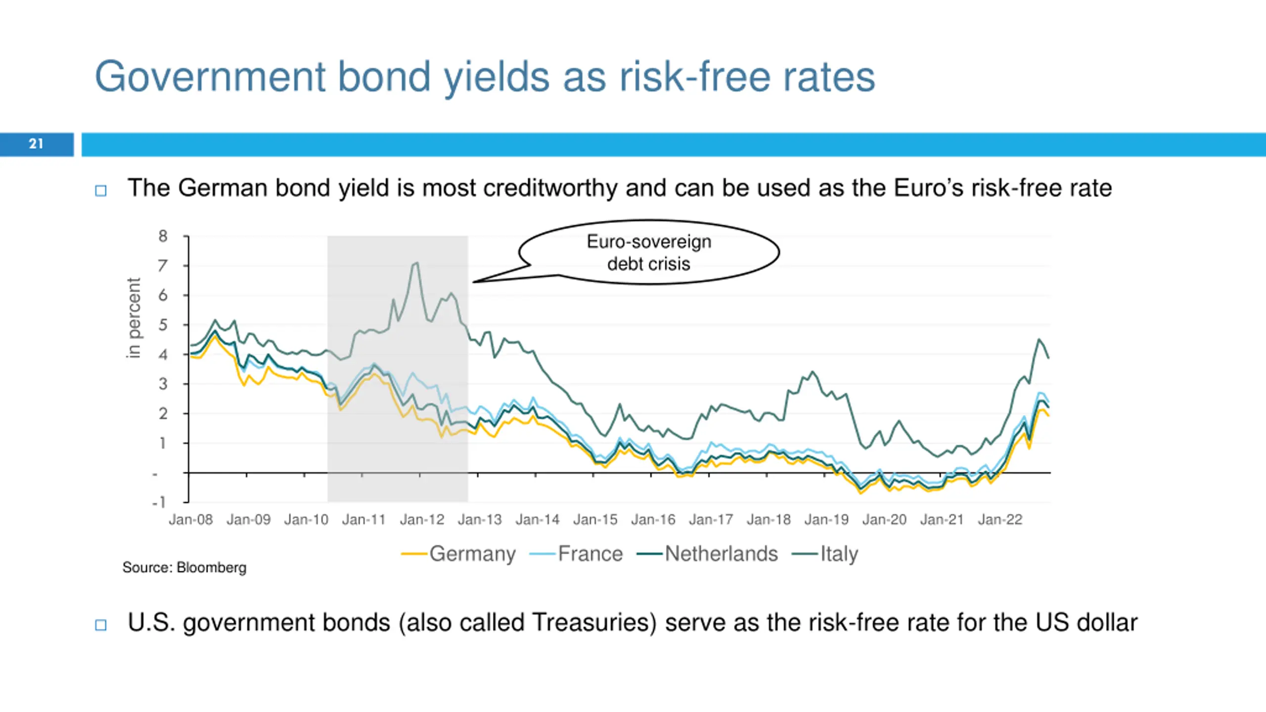 Government bond yields as risk-free rates 21 The German bond yield is most creditworthy and can be used as the Euro s risk-free rate 8 Euro-sovereign debt crisis 7 in percent 6 5 4 3 2 1 - -1 Jan-08 Jan-09 Jan-10 Jan-11 Jan-12 Jan-13 Jan-14 Jan-15 Jan-16 Jan-17 Jan-18 Jan-19 Jan-20 Jan-21 Jan-22 Germany France Netherlands Italy Source: Bloomberg U.S. government bonds (also called Treasuries) serve as the risk-free rate for the US dollar