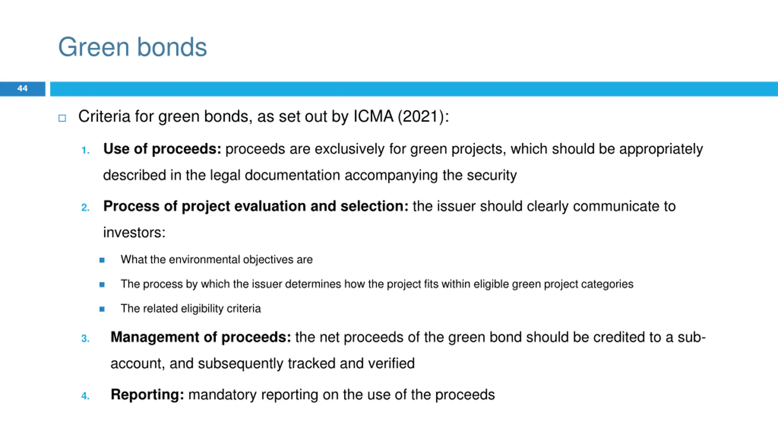 Green bonds 44 Criteria for green bonds, as set out by ICMA (2021): Use of proceeds: proceeds are exclusively for green projects, which should be appropriately 1. described in the legal documentation accompanying the security Process of project evaluation and selection: the issuer should clearly communicate to 2. investors: What the environmental objectives are The process by which the issuer determines how the project fits within eligible green project categories The related eligibility criteria Management of proceeds: the net proceeds of the green bond should be credited to a sub- 3. account, and subsequently tracked and verified Reporting: mandatory reporting on the use of the proceeds 4.