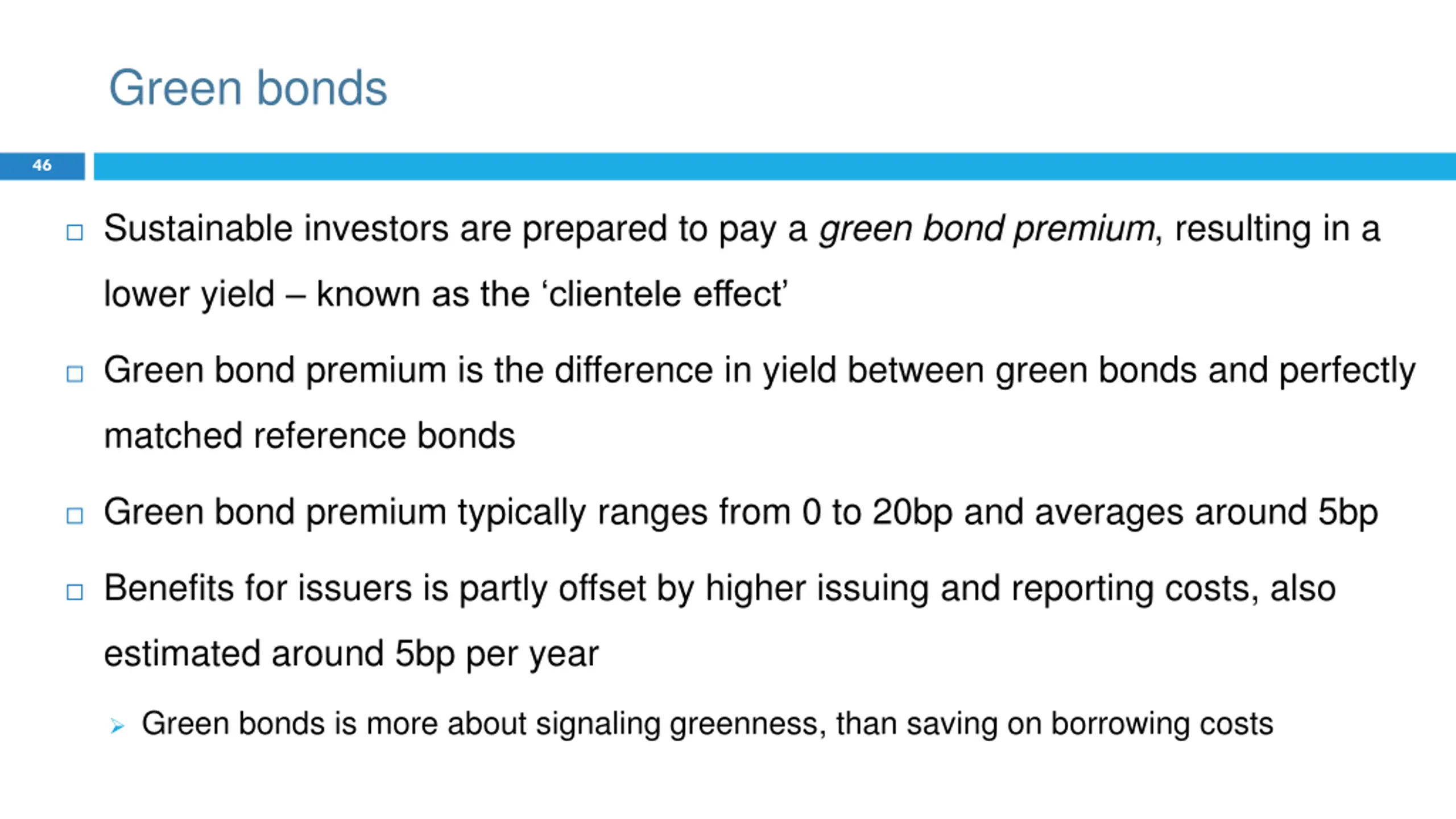 Green bonds 46 Sustainable investors are prepared to pay a green bond premium, resulting in a lower yield known as the clientele effect Green bond premium is the difference in yield between green bonds and perfectly matched reference bonds Green bond premium typically ranges from 0 to 20bp and averages around 5bp Benefits for issuers is partly offset by higher issuing and reporting costs, also estimated around 5bp per year Green bonds is more about signaling greenness, than saving on borrowing costs