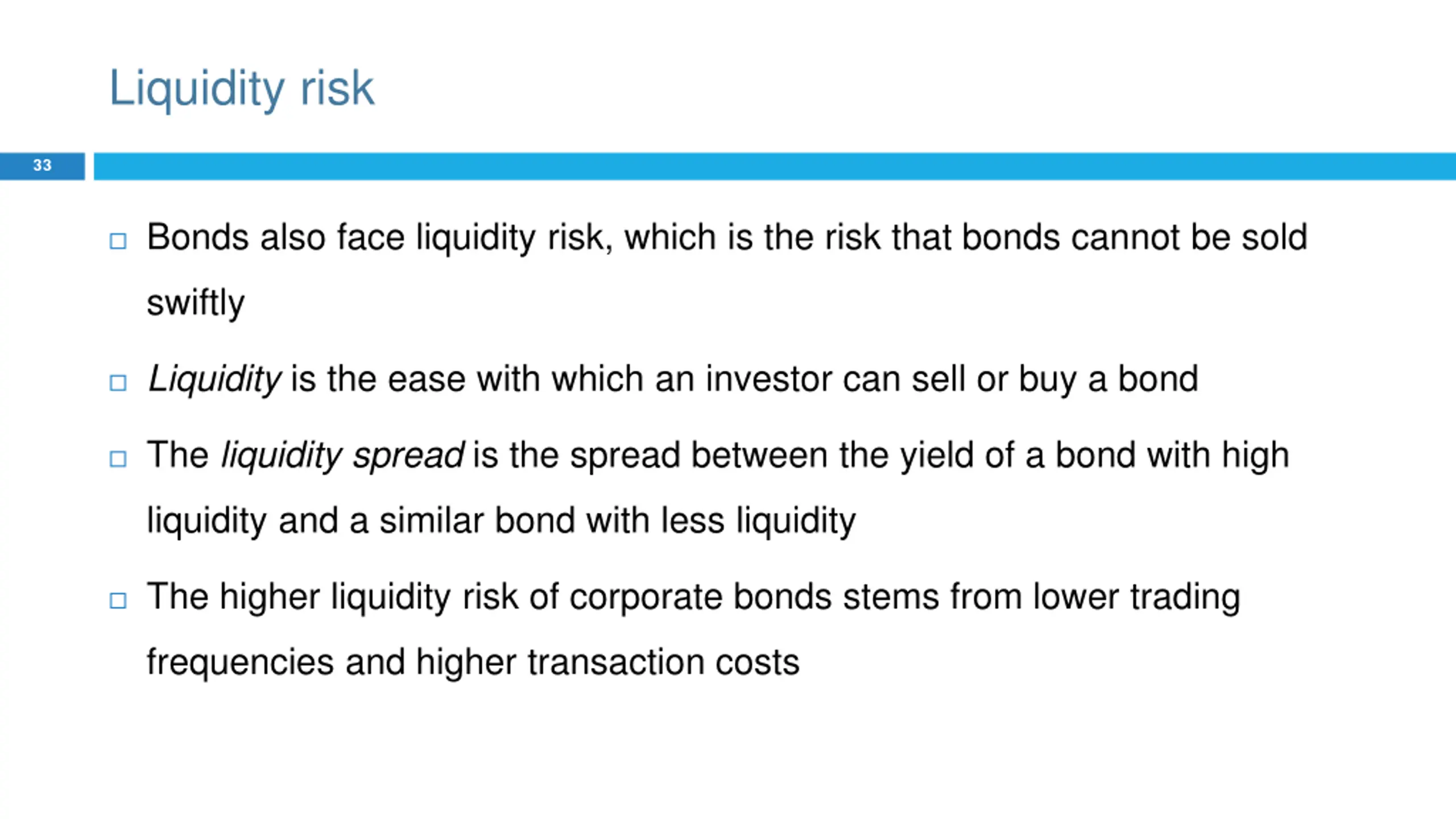Liquidity risk 33 Bonds also face liquidity risk, which is the risk that bonds cannot be sold swiftly Liquidity is the ease with which an investor can sell or buy a bond The liquidity spread is the spread between the yield of a bond with high liquidity and a similar bond with less liquidity The higher liquidity risk of corporate bonds stems from lower trading frequencies and higher transaction costs