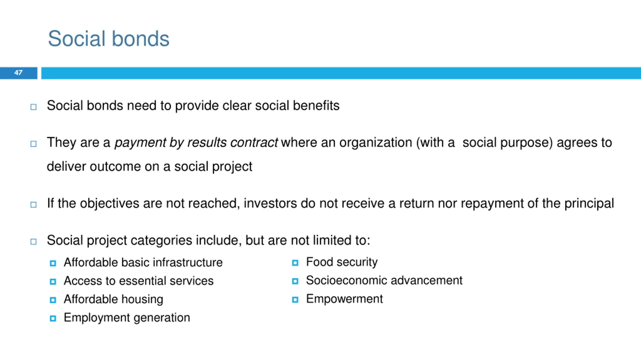 Social bonds 47 Social bonds need to provide clear social benefits They are a payment by results contract where an organization (with a social purpose) agrees to deliver outcome on a social project If the objectives are not reached, investors do not receive a return nor repayment of the principal Social project categories include, but are not limited to: Food security Affordable basic infrastructure Socioeconomic advancement Access to essential services Empowerment Affordable housing Employment generation