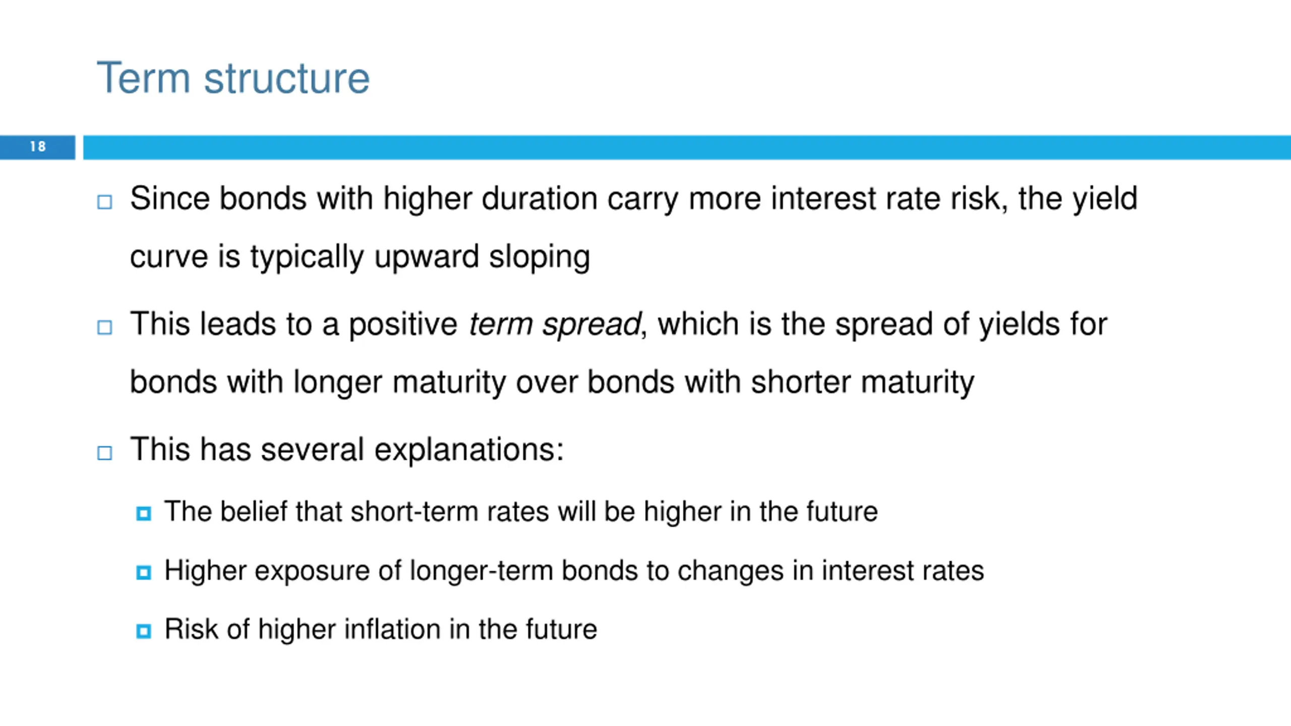 Term structure 18 Since bonds with higher duration carry more interest rate risk, the yield curve is typically upward sloping This leads to a positive term spread, which is the spread of yields for bonds with longer maturity over bonds with shorter maturity This has several explanations: The belief that short-term rates will be higher in the future Higher exposure of longer-term bonds to changes in interest rates Risk of higher inflation in the future