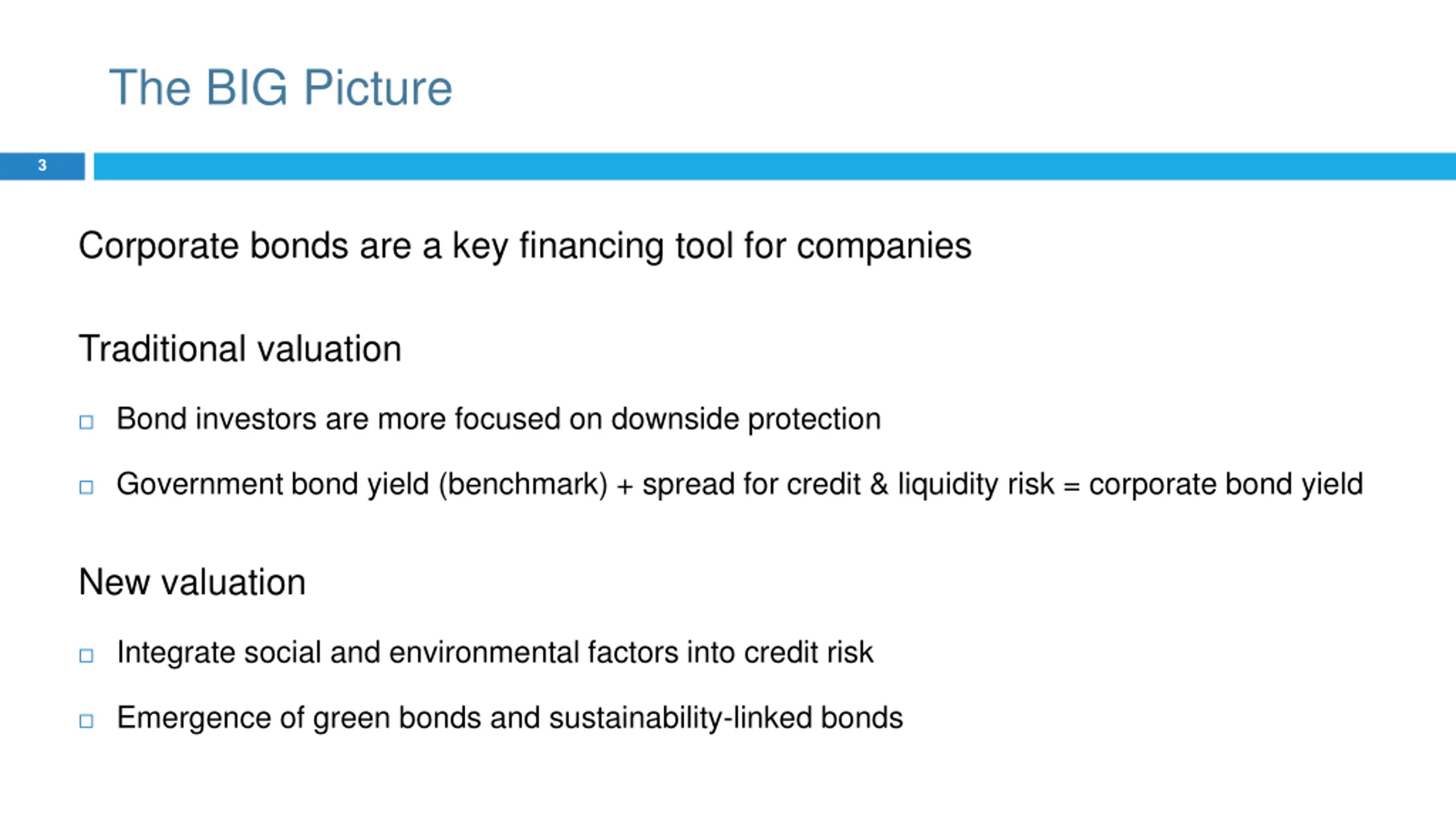The BIG Picture 3 Corporate bonds are a key financing tool for companies Traditional valuation Bond investors are more focused on downside protection Government bond yield (benchmark) + spread for credit & liquidity risk = corporate bond yield New valuation Integrate social and environmental factors into credit risk Emergence of green bonds and sustainability-linked bonds